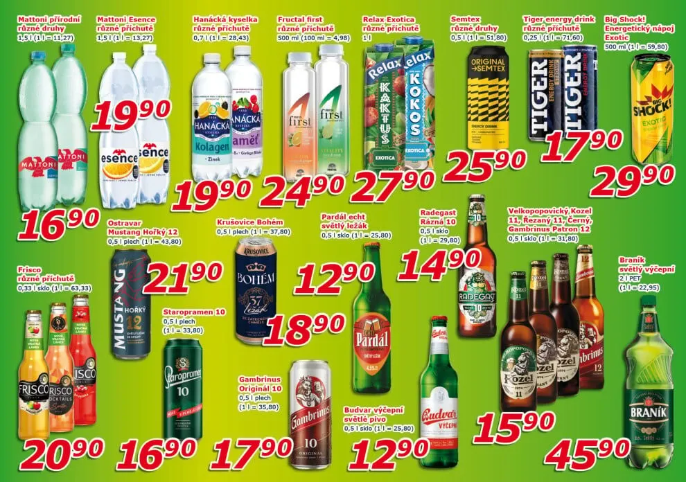 V letáku obchodu ESO MARKET najdete širokou nabídku nápojů a potravin. Mezi oblíbené produkty patří Mattoni s různými příchutěmi, Hanácká kyselka a Fructal. Pro milovníky energetických nápojů máme v nabídce Big Shock a Semtex. Nezapomněli jsme ani na pivo, jako je Krušovice a Pardál, které jsou k dostání za výhodné ceny. Všechny produkty jsou pečlivě vybrány, aby splnily vaše očekávání a přinesly vám radost z nákupu. Navštivte nás a objevte skvělé nabídky!
