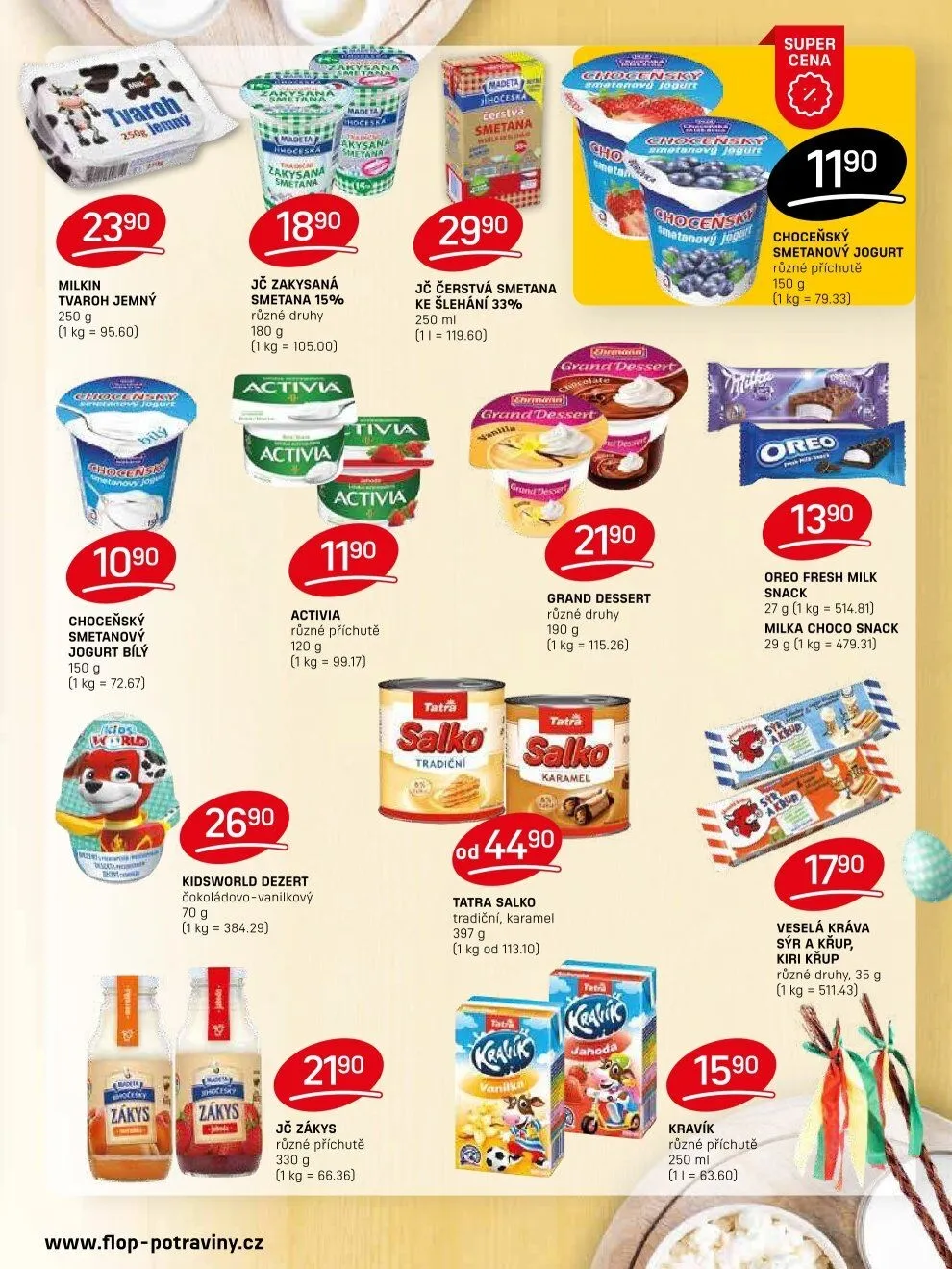 V letáku obchodu FLOP najdete širokou nabídku mléčných výrobků a dezertů. Mezi nimi je jemný tvaroh Milkin v balení 250 g za 239 Kč, smetanový jogurt Choceňský v bílém provedení 150 g za 109 Kč a zakysaná smetana JČ v různých druzích 180 g za 189 Kč.