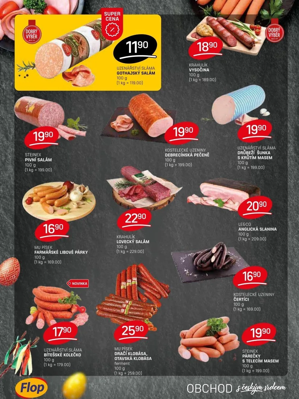 V letáku obchodu FLOP najdete široký výběr kvalitních uzenin a masných výrobků. Mezi nimi se objevují: