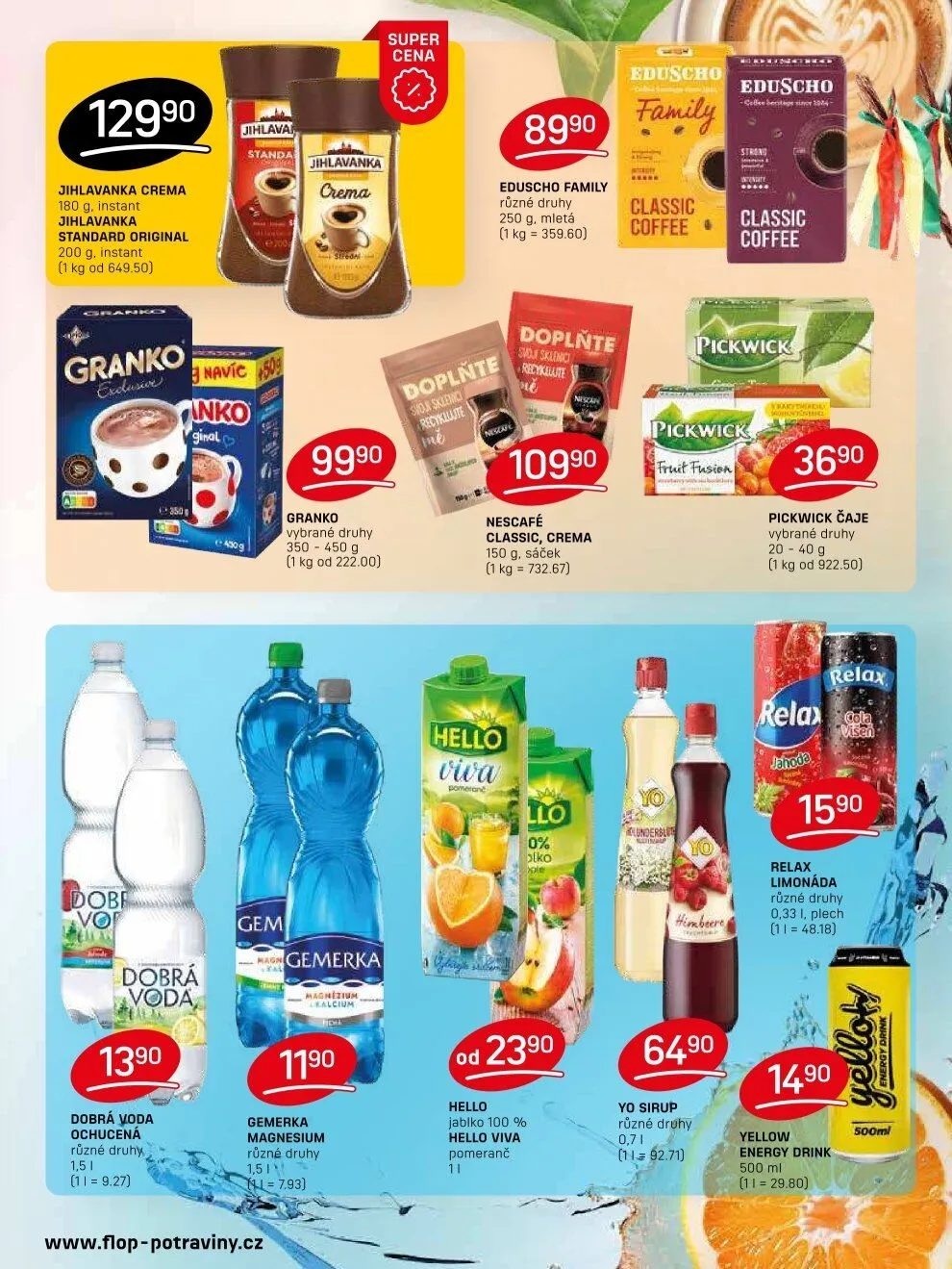 V letáku obchodu FLOP najdete širokou nabídku kvalitních produktů za skvělé ceny. Mezi oblíbené kávové varianty patří Eduscho Classic a Jihlavanka, které jsou dostupné v různých formách, včetně instantní kávy. Pro milovníky čajů máme vybrané druhy Pickwick čajů.