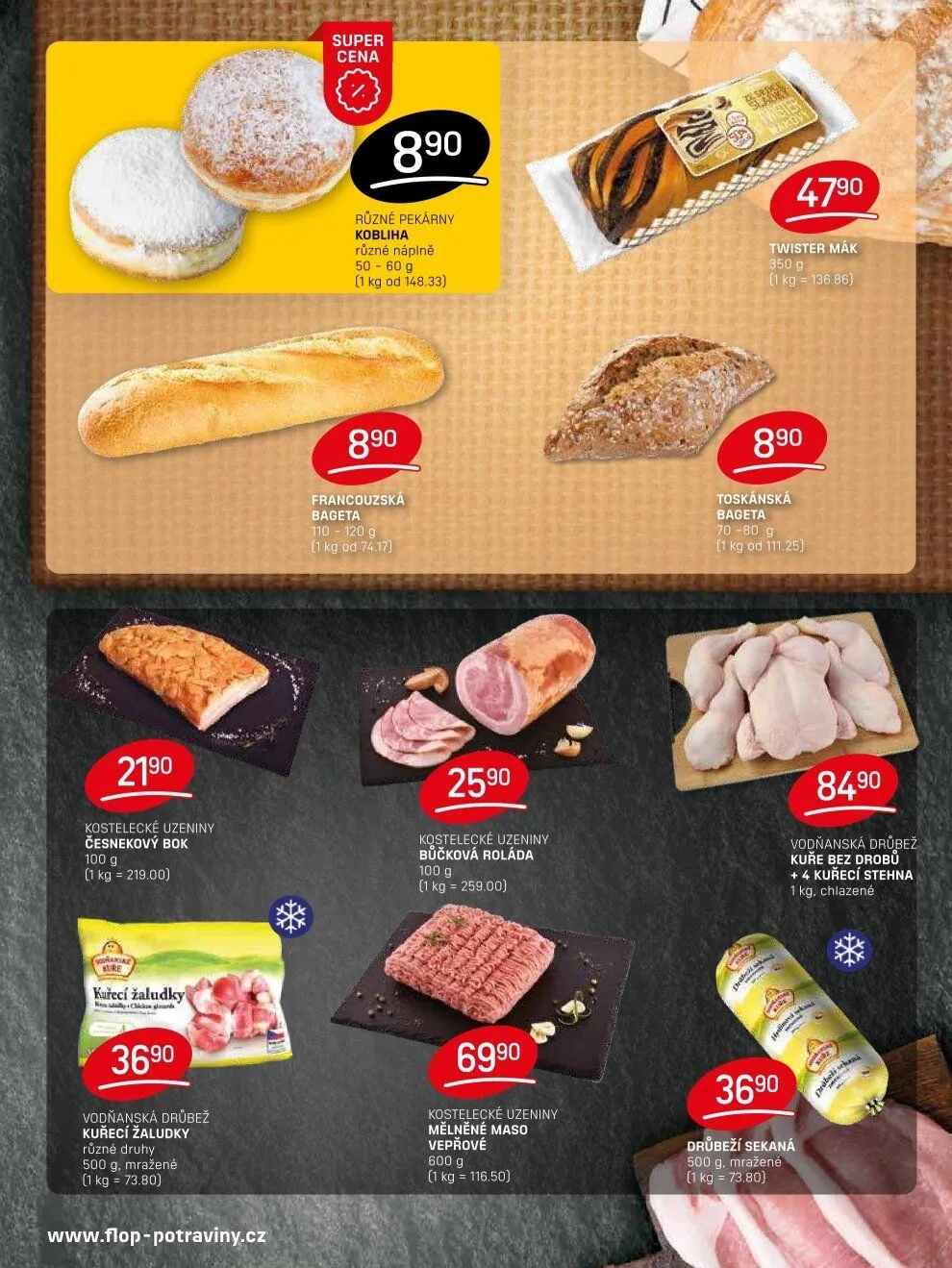 V letáku obchodu FLOP najdete širokou nabídku kvalitních potravin. Mezi nimi jsou kostelecké uzeniny, jako česnekový bok za 219 Kč/100 g a bůčková roláda za 259 Kč/100 g. Dále nabízíme kuřecí žaludky od vodňanské drůbeže, mražené v balení 500 g za 369 Kč.