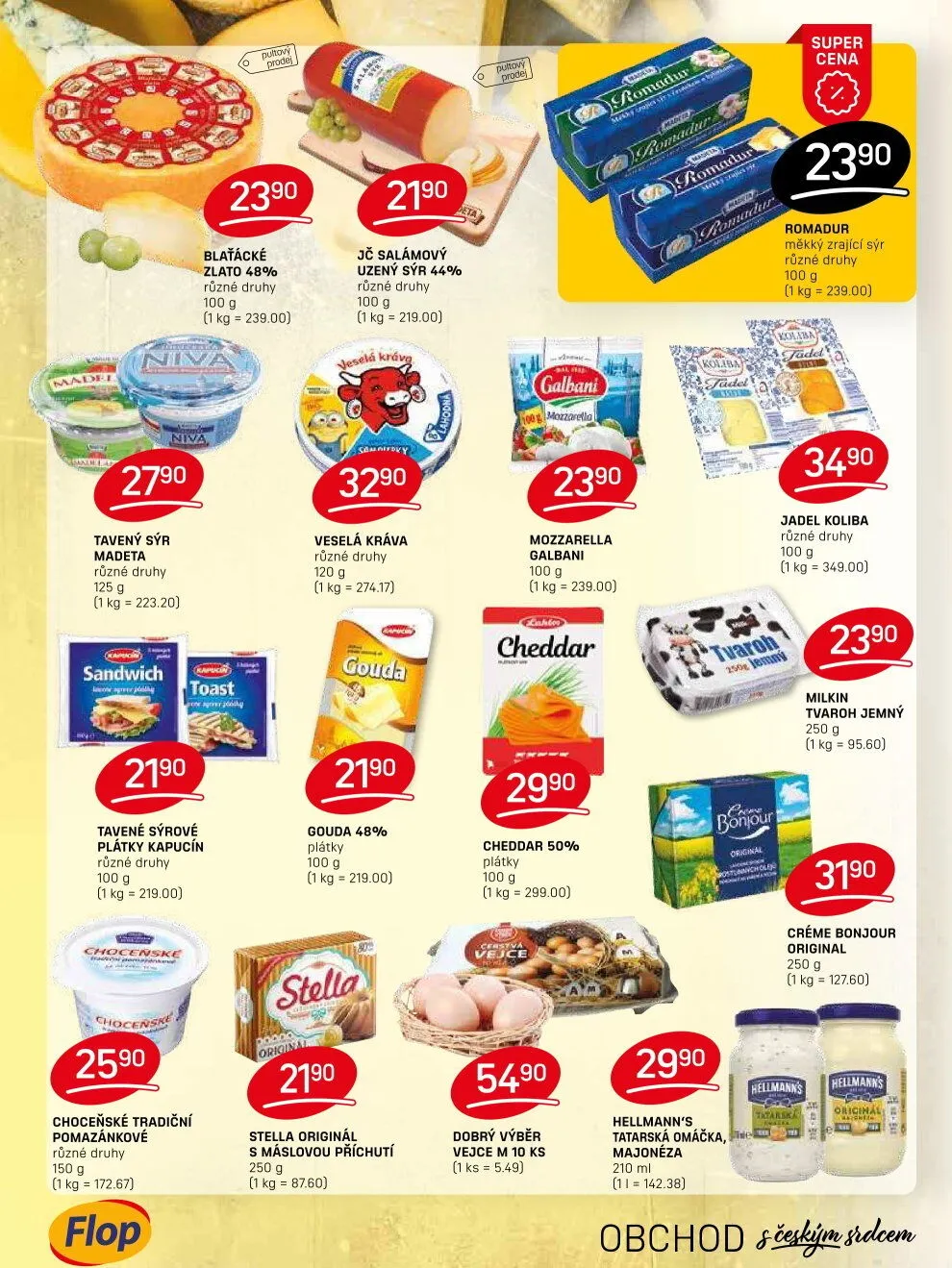 V letáku obchodu FLOP najdete širokou nabídku kvalitních produktů za skvělé ceny. Mezi nimi se objevují různé druhy tavených sýrů, jako je Madeta a plátky Kapucín, které jsou ideální pro přípravu sendvičů. Dále nabízíme tradiční pomazánkové sýry z Choceňska a jemný tvaroh Milkin.