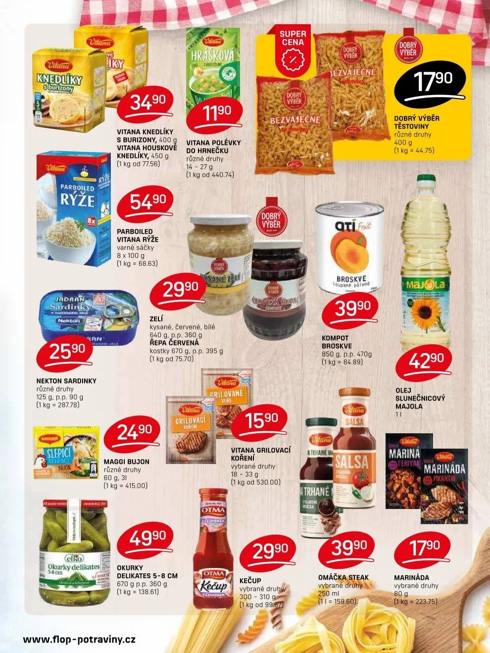 V letáku obchodu FLOP najdete široký výběr kvalitních potravin za skvělé ceny. Nabízíme Vitana knedlíky s burizony a houskové knedlíky, ideální pro přípravu tradičních pokrmů. Dále máme parboiled rýži v praktických varných sáčcích.