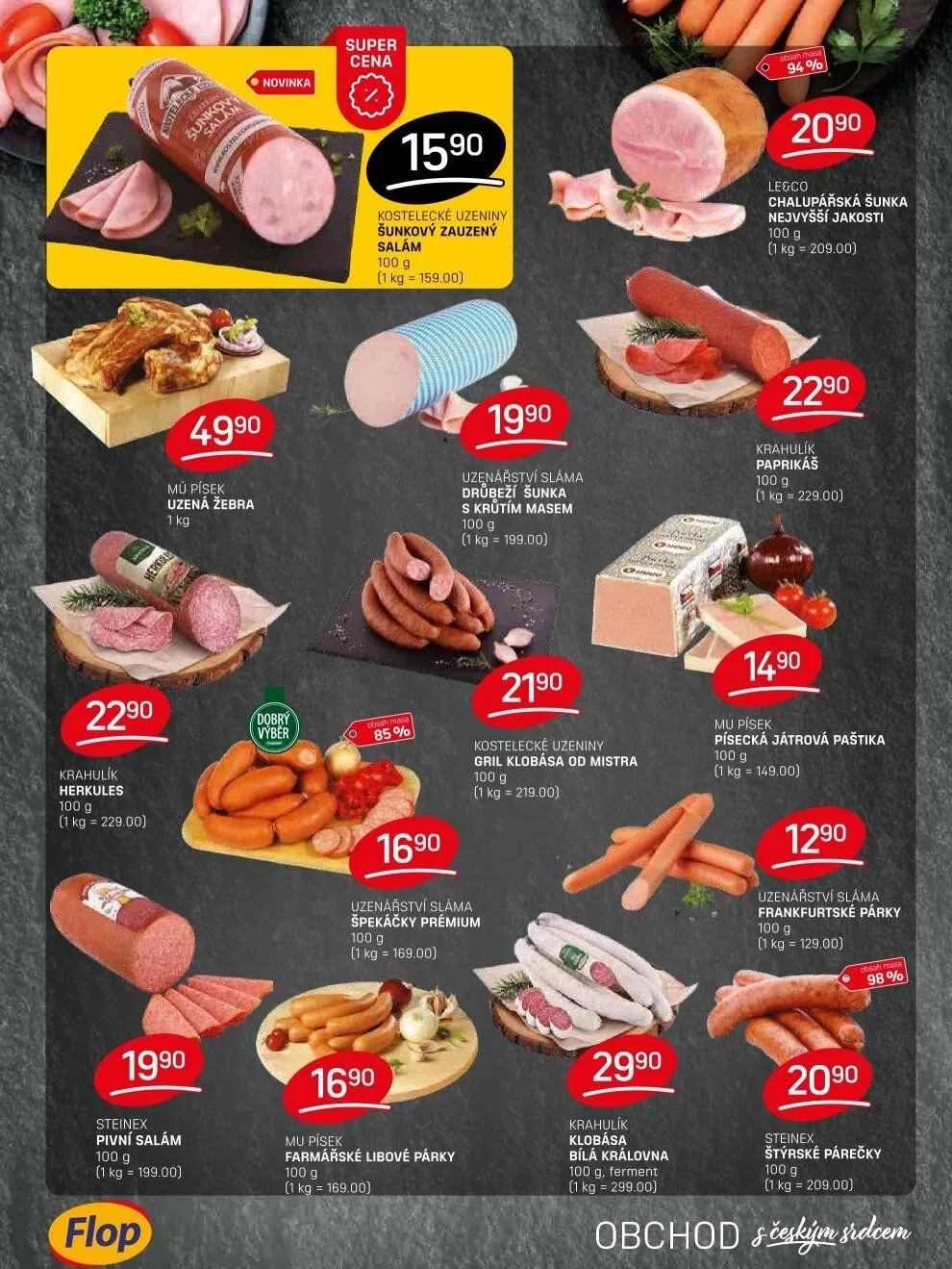 V letáku obchodu FLOP najdete širokou nabídku kvalitních uzenin a masných výrobků. Mezi novinkami se objevuje Mij písek, který je k dostání za skvělou cenu 49,90 Kč. Dále nabízíme uzená žebra za 159,00 Kč za kilogram a šunkový zauzený salám od Kosteleckých uzenin za 159,00 Kč za 100 g.