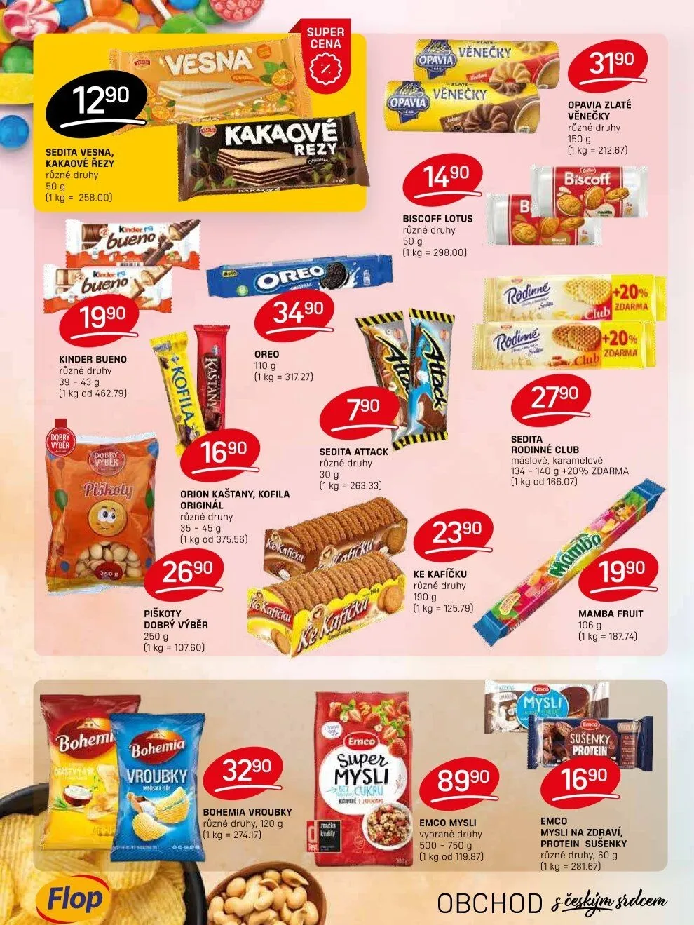 V letáku obchodu FLOP najdete širokou nabídku lahodných produktů. Mezi nimi jsou kakaové řezy Sedita Vesna za 129 Kč, Kinder Bueno v různých druzích za 199 Kč, a oblíbené Oreo sušenky za 34 Kč.