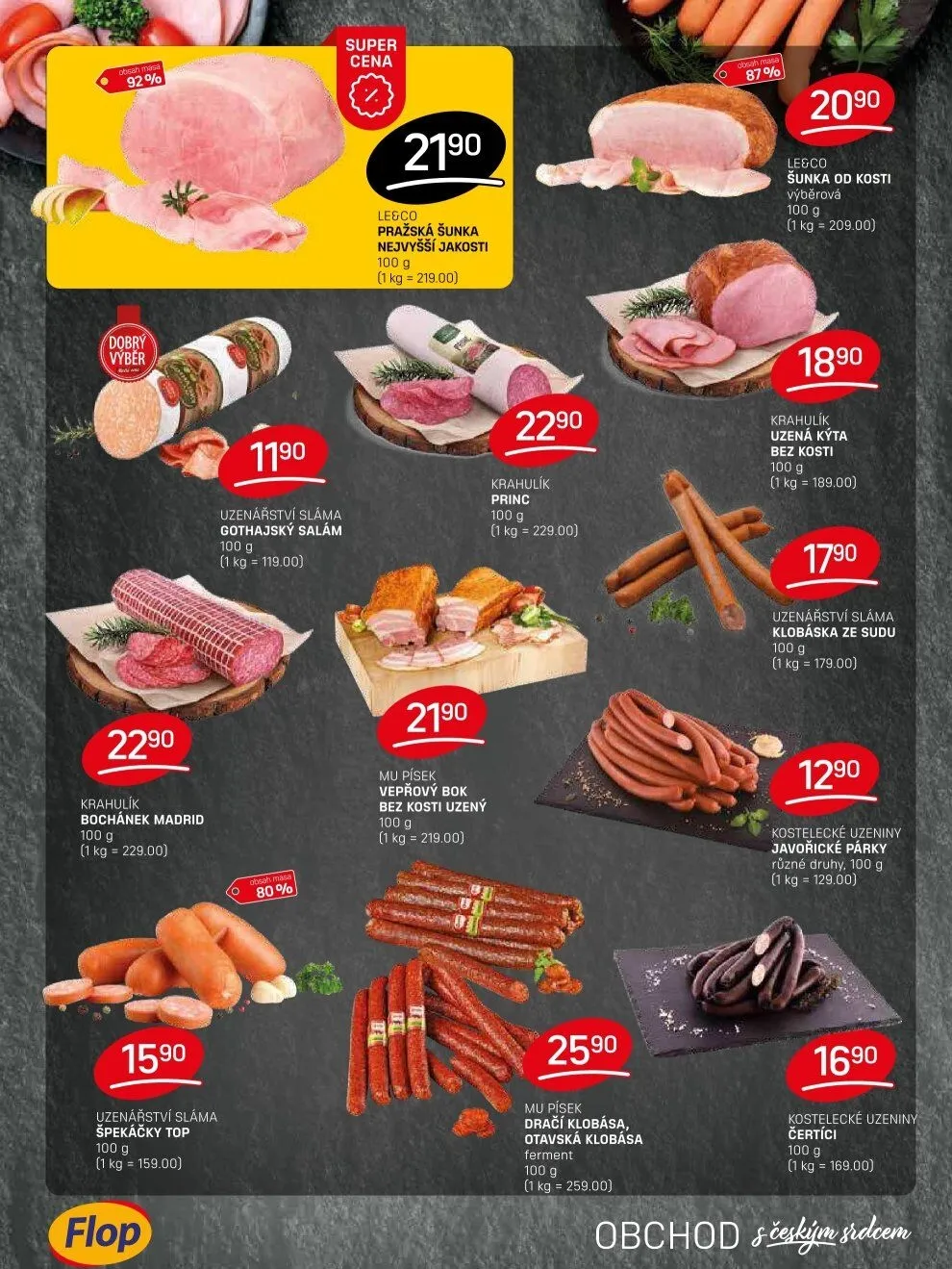 V letáku obchodu FLOP najdete širokou nabídku kvalitních uzenin a masných výrobků. Mezi nimi se objevují:
