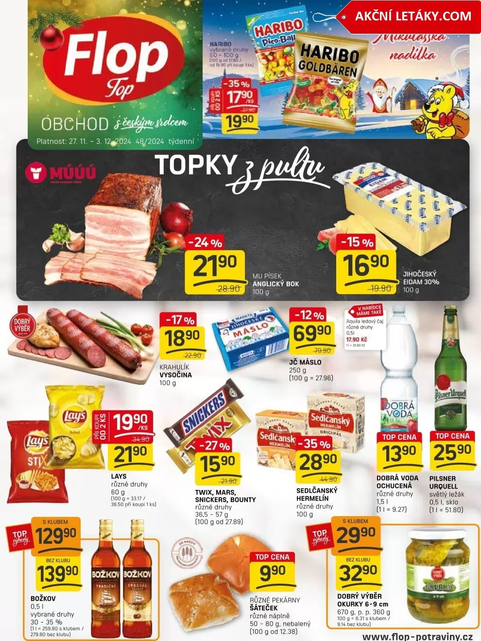 V letáku obchodu FLOP TOP najdete široký výběr kvalitních produktů za skvělé ceny. Nabízíme například anglický bok za 13,90 Kč, vybrané druhy božkovského alkoholu od 17,90 Kč a jihočeský eidam za 16,90 Kč. Nezapomeňte také na oblíbené snacky jako Lays za 25,90 Kč nebo sladkosti Twix, Mars a Snickers za 25,90 Kč.