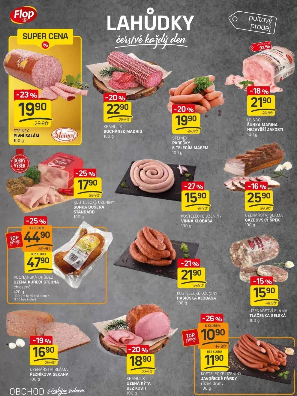 V letáku obchodu FLOP TOP najdete skvělé nabídky na lahůdky a uzeniny.