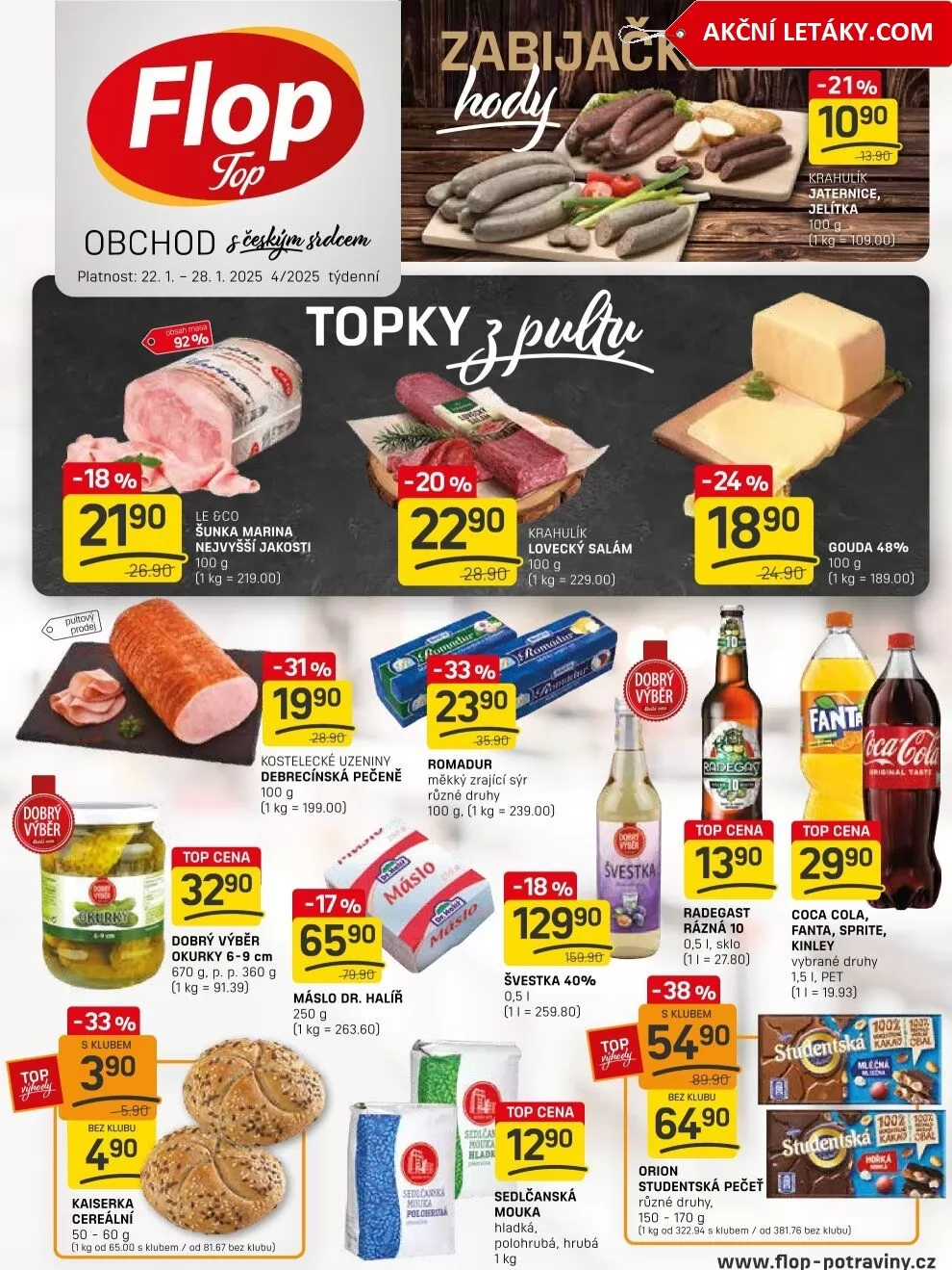 V letáku obchodu FLOP TOP najdete široký výběr kvalitních potravin za skvělé ceny. Mezi nabízenými produkty se objevují jaternice a jelítka, které jsou nyní za zvýhodněnou cenu 210 Kč za 100 g. Dále si můžete pořídit šunku marina nejvyšší jakosti za 219 Kč za 100 g, nebo krahulík lovecký salám za 199 Kč za 100 g.