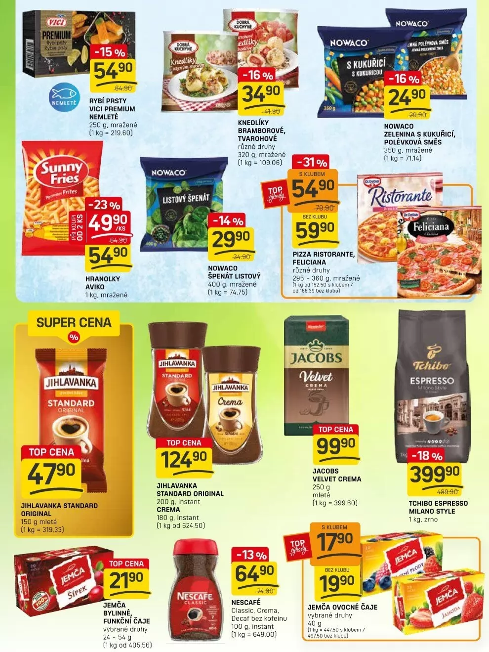 Pro milovníky hranolků máme vynikající Aviko hranolky a pro příznivce kávy nabízíme mletou kávu Jacobs Velvet Crema a Tchibo Espresso Milano Style.