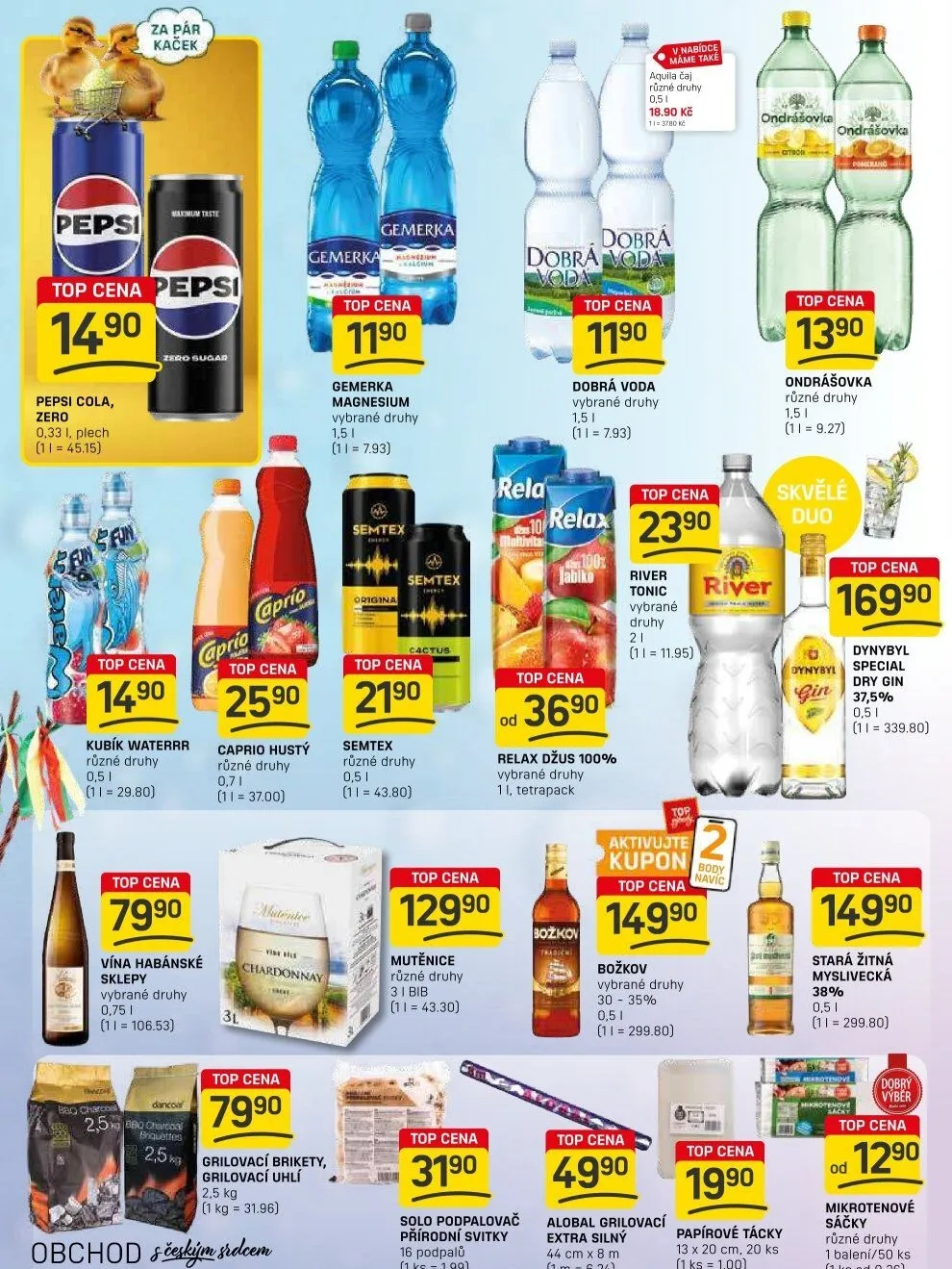 Čaj a Dobrá voda jsou k dostání za 18,90 Kč a 11,90 Kč.