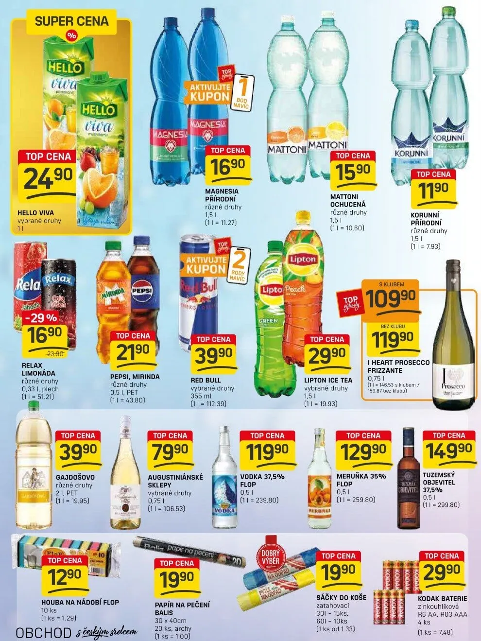 V letáku obchodu FLOP TOP najdete skvělé nabídky na široký sortiment produktů. Mezi nimi se objevují vybrané druhy nápojů jako Red Bull a Mattoni ochucená, které jsou k dostání za top ceny. Nezapomeňte také na přírodní minerální vodu Korunní a osvěžující limonády Pepsi a Relax.
