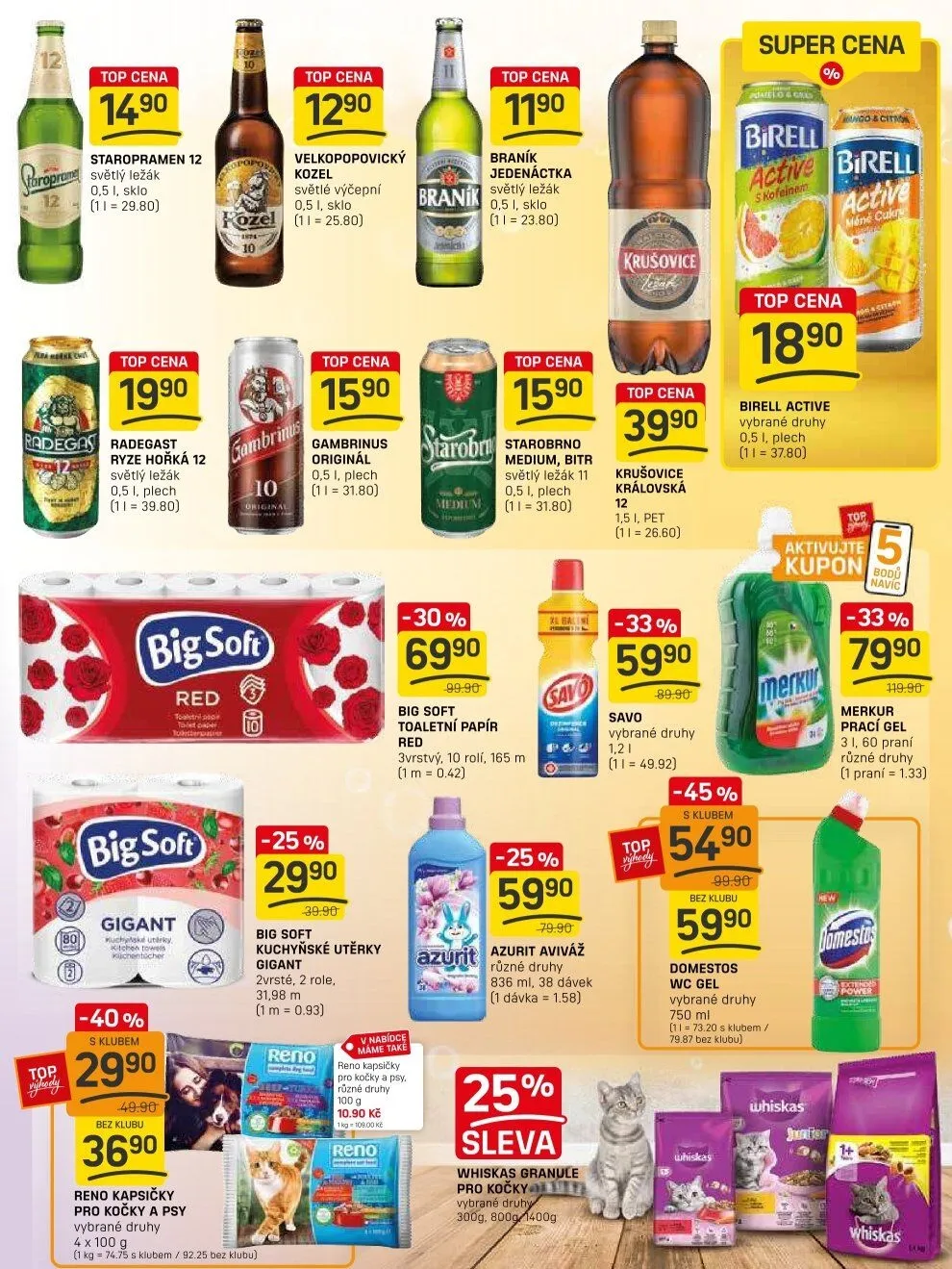 V letáku obchodu FLOP TOP najdete širokou nabídku produktů za skvělé ceny. Mezi oblíbené nápoje patří Staropramen 12 světlý ležák v plechovce za 29,80 Kč, Radegast Ryze Hořká 12 v plechu za 39,80 Kč a Velkopopovický Kozel světlé výčepní za 25,80 Kč.