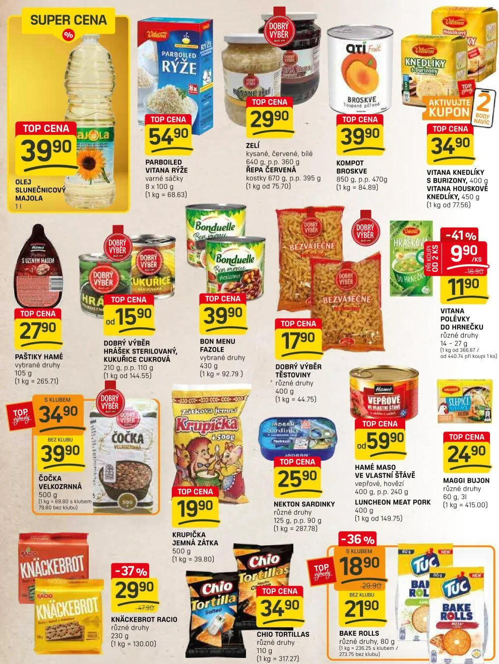 Nezapomeňte na Vitana knedlíky s burizony za 3490 Kč a jemnou krupičku za 2990 Kč. Pro rychlé vaření nabízíme také sterilovaný hrášek a kukuřici za 1590 Kč.