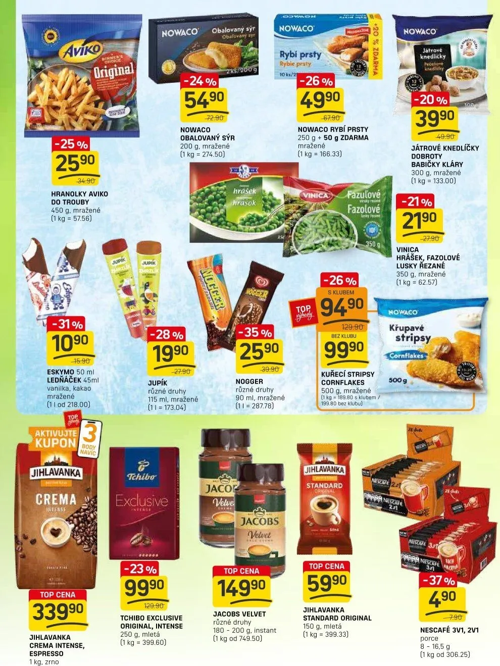 V letáku obchodu FLOP TOP najdete širokou nabídku mražených produktů a kávových specialit. Mezi oblíbené položky patří hranolky Aviko, které jsou nyní za skvělou cenu 259 Kč za 450 g. Dále nabízíme obalovaný sýr a rybí prsty od značky Nowaco, které jsou také v akci.