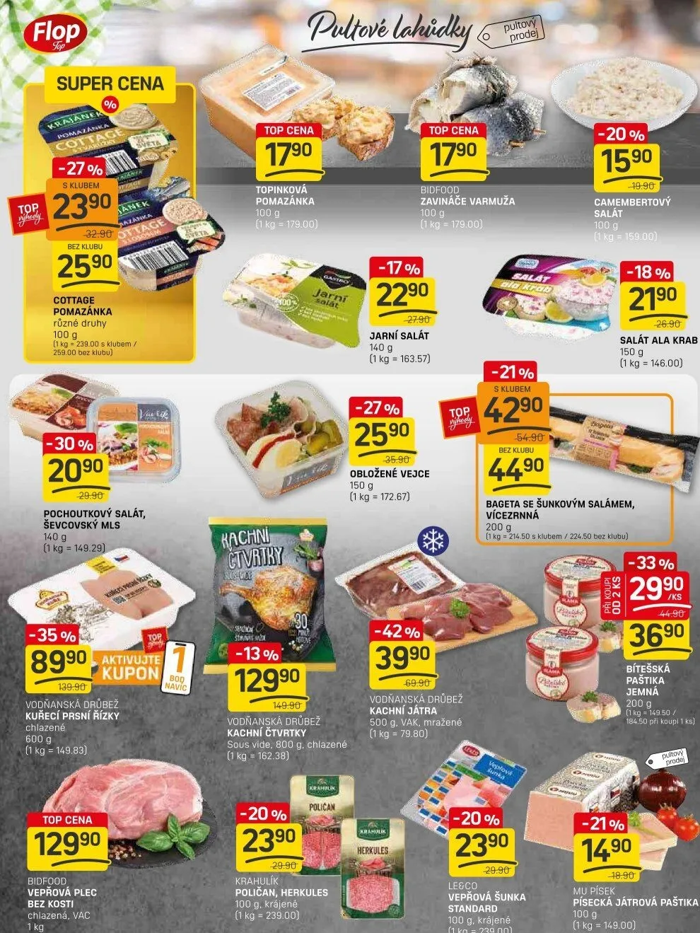 V letáku obchodu FLOP TOP najdete širokou nabídku kvalitních produktů za skvělé ceny. Mezi nimi se nachází cottage pomazánka v různých druzích za 23 Kč za 100 g, nebo pochoutkový salát Ševcovský mls za 89 Kč za 140 g.