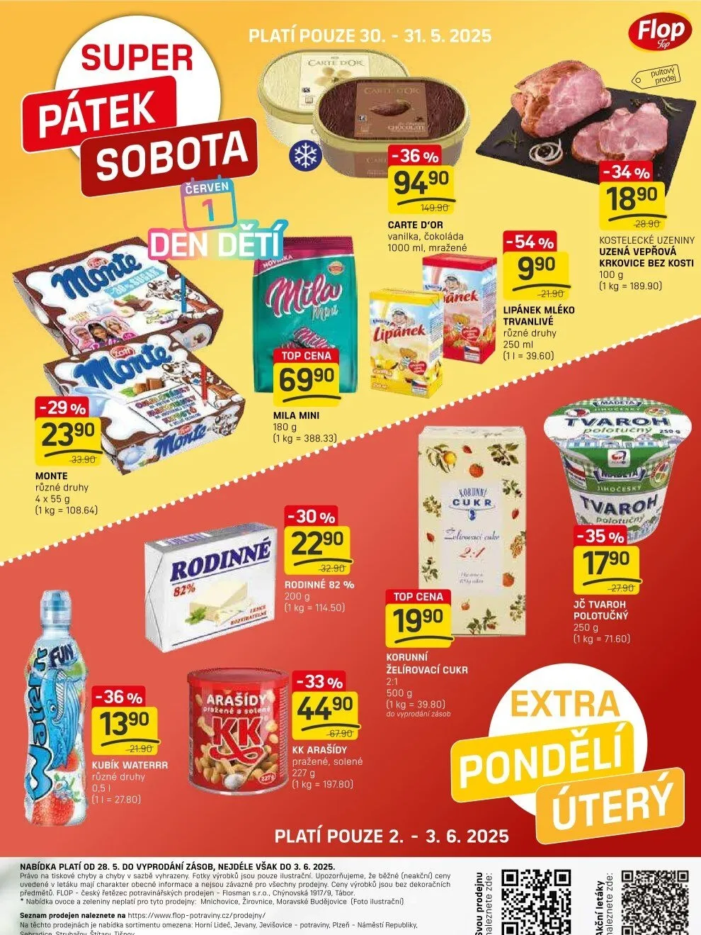 V letáku obchodu FLOP TOP najdete skvělé akční nabídky, které platí od 2. do 3. června 2025. Mezi produkty se můžete těšit na mraženou zmrzlinu Carte d'Or v příchutích vanilka a čokoláda za 199 Kč (1000 ml), želírovací cukr 2:1 za 39,90 Kč (500 g), trvanlivé mléko Lipánek za 9,90 Kč (250 ml) a uzenou vepřovou krkovici Kostelecké uzeniny za 18,90 Kč (100 g). Dále nabízíme různé druhy dezertu Monte za 13,90 Kč (4x55 g) a polotučný tvaroh za 17,90 Kč (250 g). Nezapomeňte, že nabídka platí do vyprodání zásob!