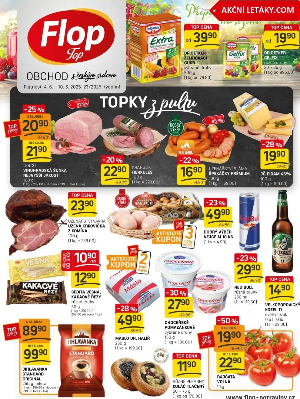 V letáku obchodu FLOP TOP najdete skvělé nabídky na široký sortiment produktů. Mezi nimi se objevují kvalitní výrobky značky Dr. Oetker, které jsou nyní za top ceny. Například šunka Vinohradská nejvyšší jakosti za 1990 Kč/100 g, nebo kakaové řezy Sedita Vesna za 1099 Kč/50 g.