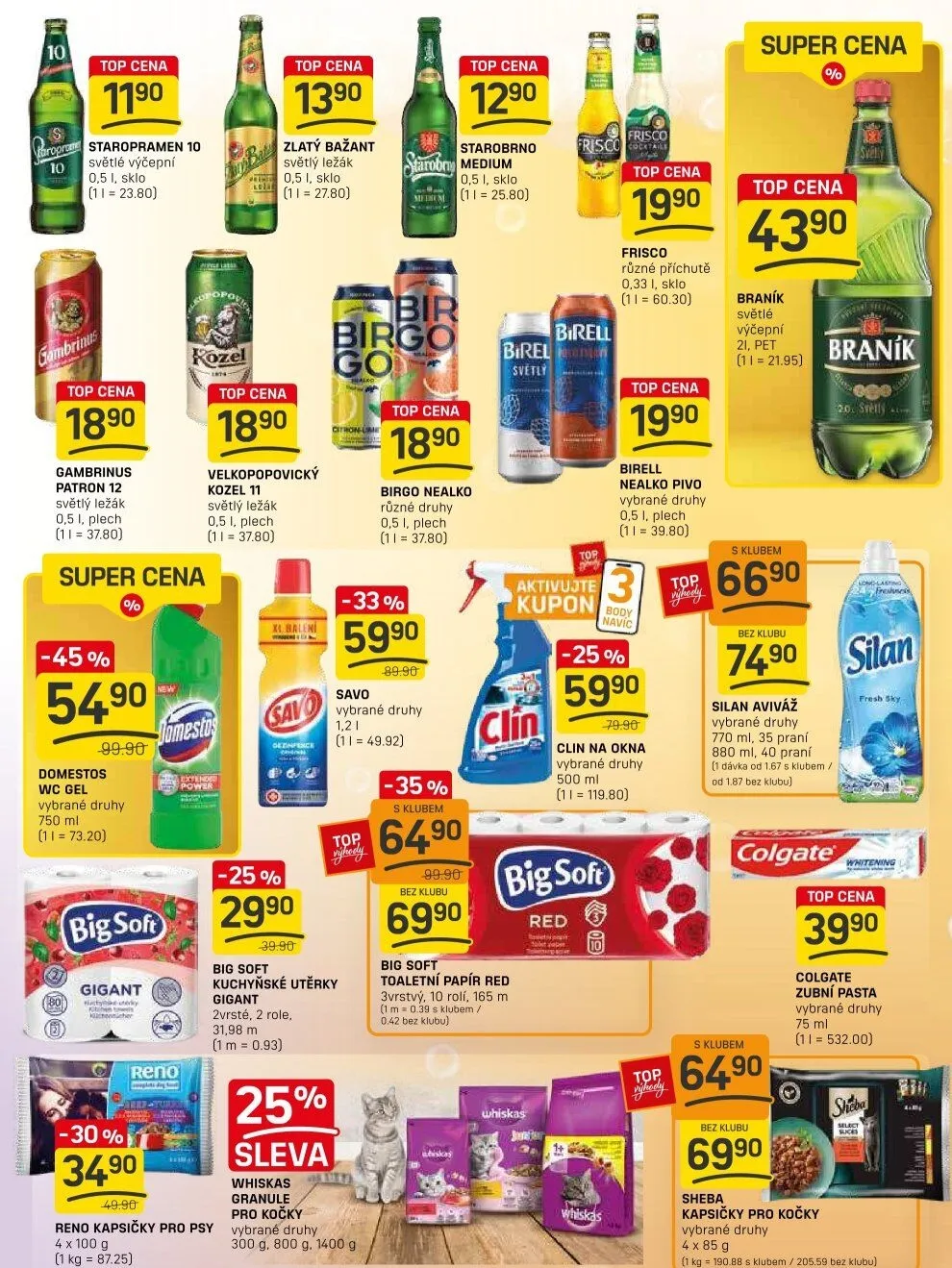 V letáku obchodu FLOP TOP najdete širokou nabídku produktů za skvělé ceny. Mezi oblíbené nápoje patří Staropramen 10 světlé výčepní za 1190 Kč a Zlatý Bažant světlý ležák za 1390 Kč. Pro milovníky nealkoholických nápojů je k dispozici Birell za 1990 Kč a Frisco v různých příchutích také za 1990 Kč.