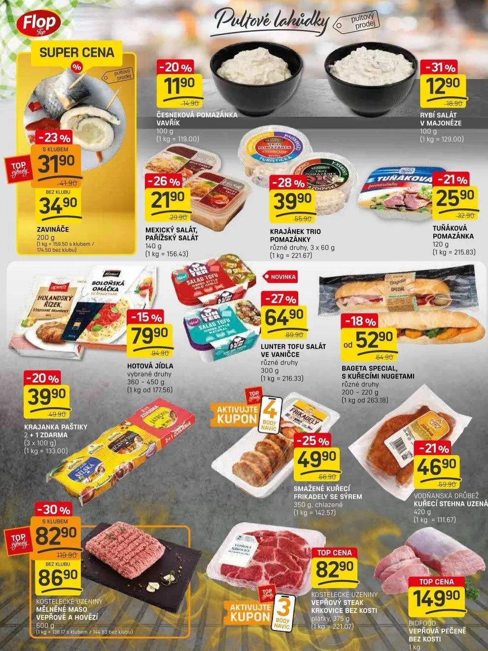V letáku obchodu FLOP TOP najdete skvělé nabídky na široký sortiment produktů. Zavináče 200 g jsou nyní za super cenu 119 Kč s klubem, nebo 149 Kč bez klubu. Česnekový vavřín 100 g je k dostání za 119 Kč, s 26% slevou.