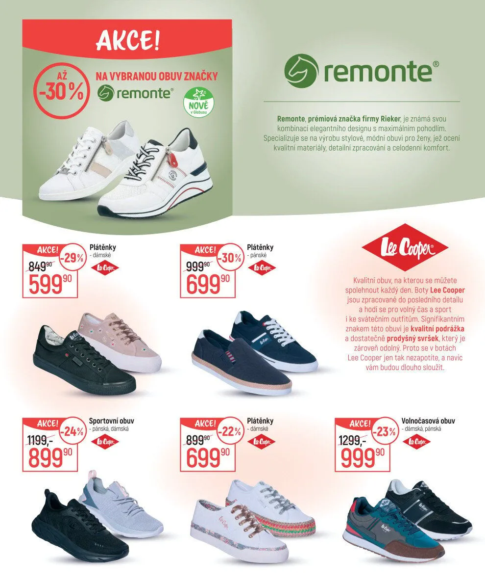 V letáku obchodu Globus najdete skvělé akce na vybranou obuv značky Remonte a Lee Cooper.