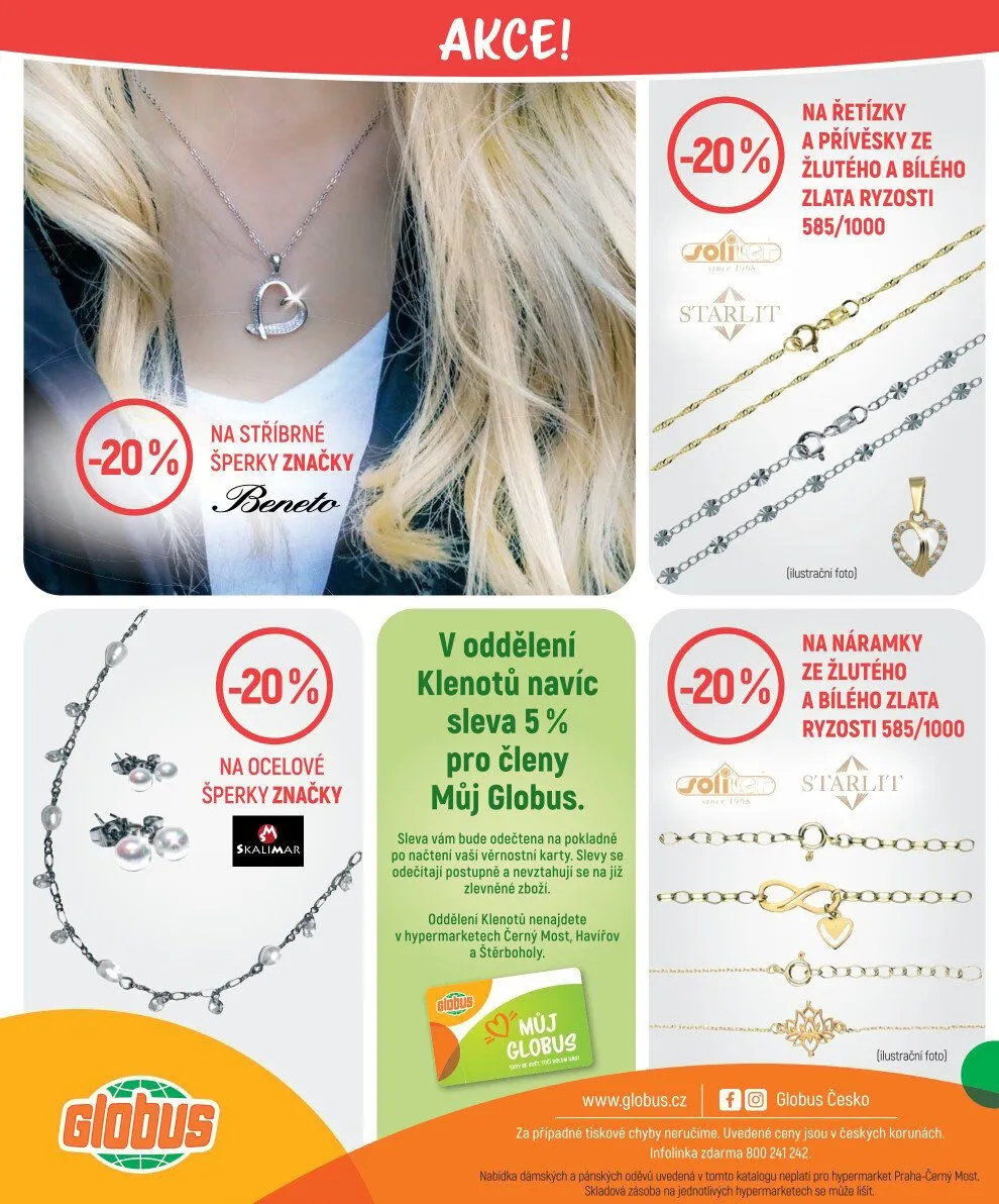 V letáku obchodu Globus najdete širokou nabídku ocelových šperků značky Skalimar, které jsou nyní k dispozici se slevou 5 % pro členy Můj Globus. Sleva se odečítá na pokladně po načtení vaší věrnostní karty. V oddělení klenotů také probíhá akce na řetízky a přívěsky ze žlutého a bílého zlata ryzosti 585/1000, stejně jako na náramky ze stejného materiálu. Nezapomeňte, že nabídka se nevztahuje na již zlevněné zboží a platí pouze v některých hypermarketech. Pro více informací navštivte www.globus.cz.