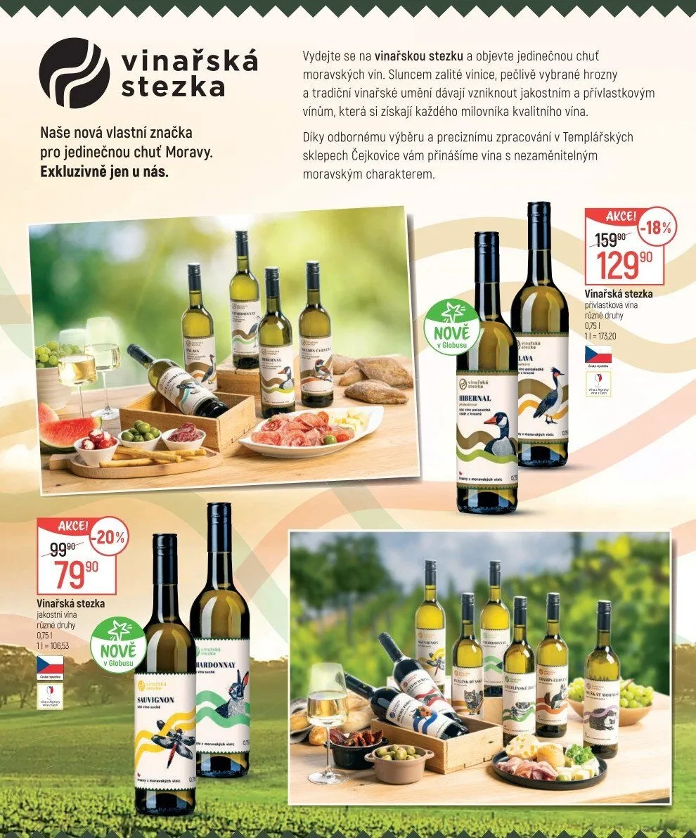 V letáku obchodu Globus najdete naši novou vlastní značku "Vinařská stezka", která přináší jedinečnou chuť Moravy. Objevte sluncem zalité vinice a pečlivě vybrané hrozny, které dávají vzniknout jakostním a přívlastkovým vínům. Tato vína, vyrobená v templářských sklepech Čejkovice, si získají srdce každého milovníka kvalitního vína.