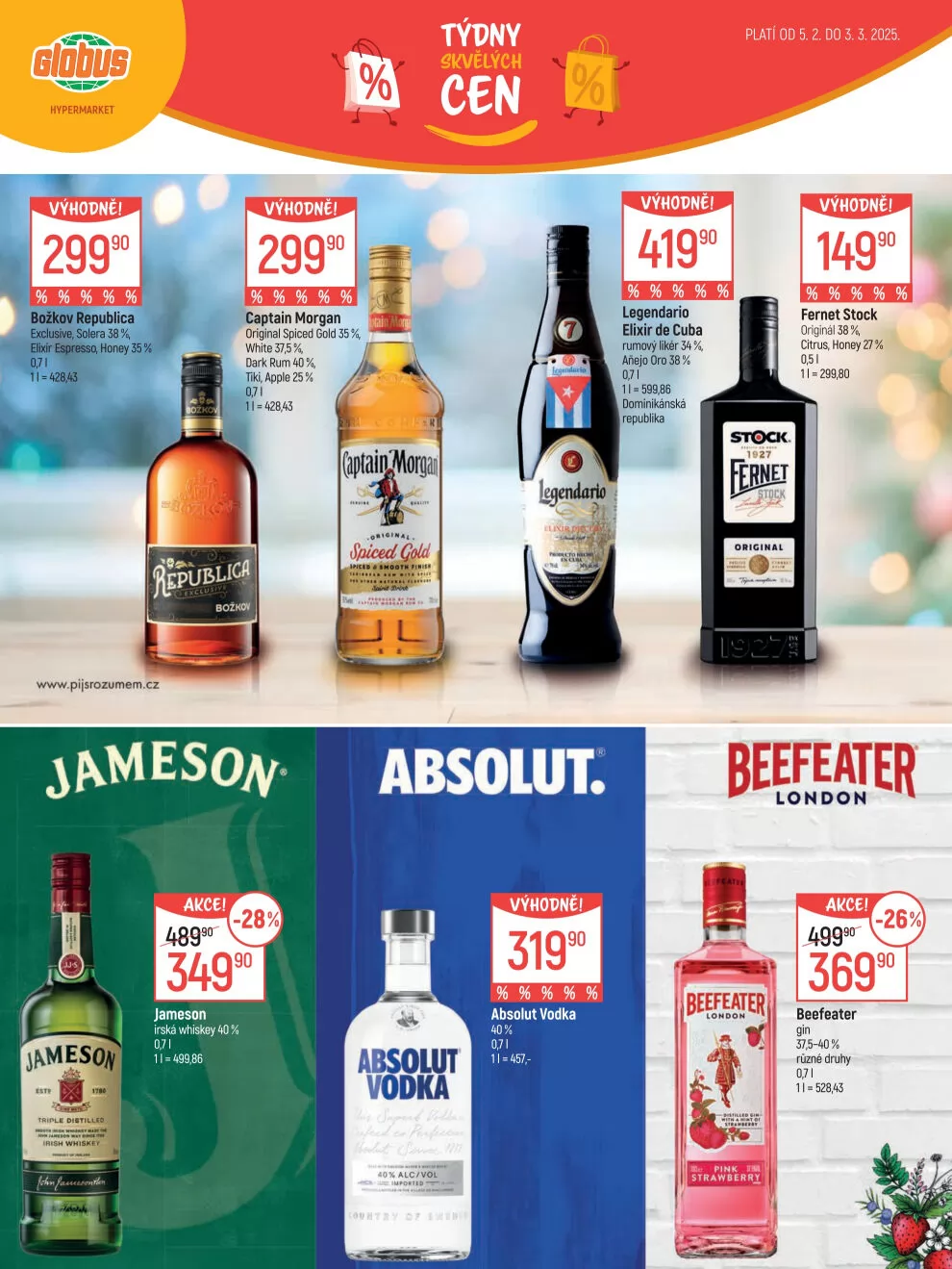V letáku obchodu Globus najdete širokou nabídku výhodných produktů. Mezi nimi se objevují populární alkoholické nápoje, jako je Božkov Republica Exclusive, Solera 38 h, a Elixír Espressu Honey s obsahem alkoholu 35 %. Dále si můžete vybrat Captain Morgan Original Spiced Gold a White, nebo Legendario Elixir de Cuba, rumový likér s 34 % alkoholu.