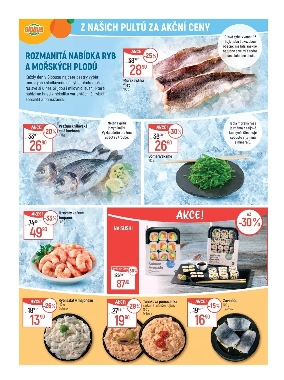 V letáku obchodu Globus najdete širokou nabídku ryb a mořských plodů za akční ceny. Každý den si můžete vybrat z pestrého sortimentu mořských i sladkovodních ryb. Pro milovníky sushi máme několik variant, které potěší vaše chuťové pohárky.