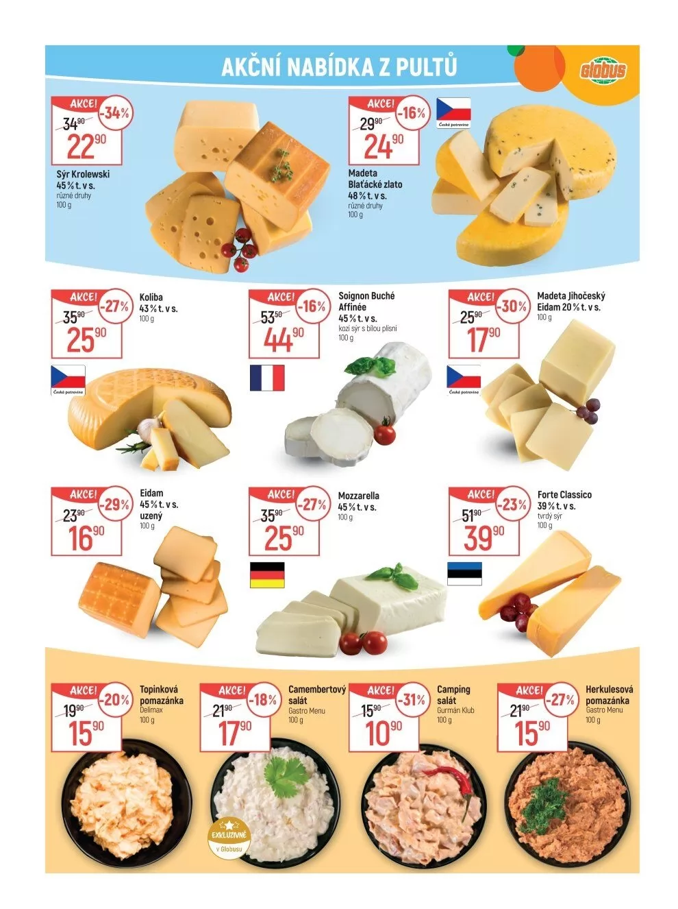 V letáku obchodu Globus najdete skvělé akční nabídky na různé sýry a pomazánky.