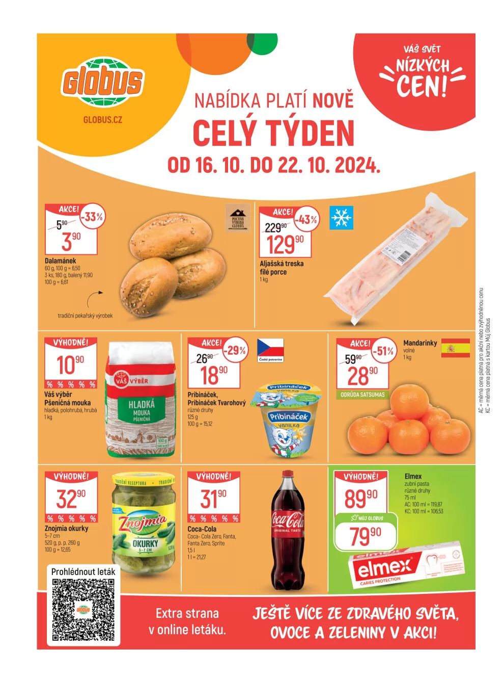 V letáku obchodu Globus najdete skvělé akční nabídky, které platí od 16.10. do 22.10.2024. Mezi lákavými produkty se objevuje aljašská treska filé za výhodnou cenu 129,90 Kč/kg. Dále si můžete vybrat z různých druhů Pribináčka, který je nyní také za skvělou cenu 90 Kč.