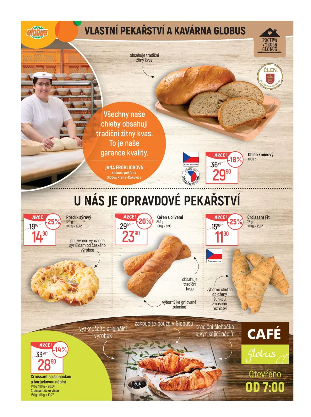 V letáku obchodu Globus najdete širokou nabídku produktů z vlastního pekařství a kavárny. Naše chleby obsahují tradiční žitný kvas, což je zárukou kvality. Mezi akčními produkty se můžete těšit na sýrový preclík, croissant se šlehačkou a borůvkovou náplní, nebo croissant s višní. Nezapomeňte také vyzkoušet chléb kmínový, který skvěle chutná k grilované zelenině. Naše produkty jsou vyrobeny z kvalitních surovin, včetně sýra eidam od českého výrobce. Navštivte nás v Globusu, kde je opravdové pekařství a kavárna otevřena od 7:00.