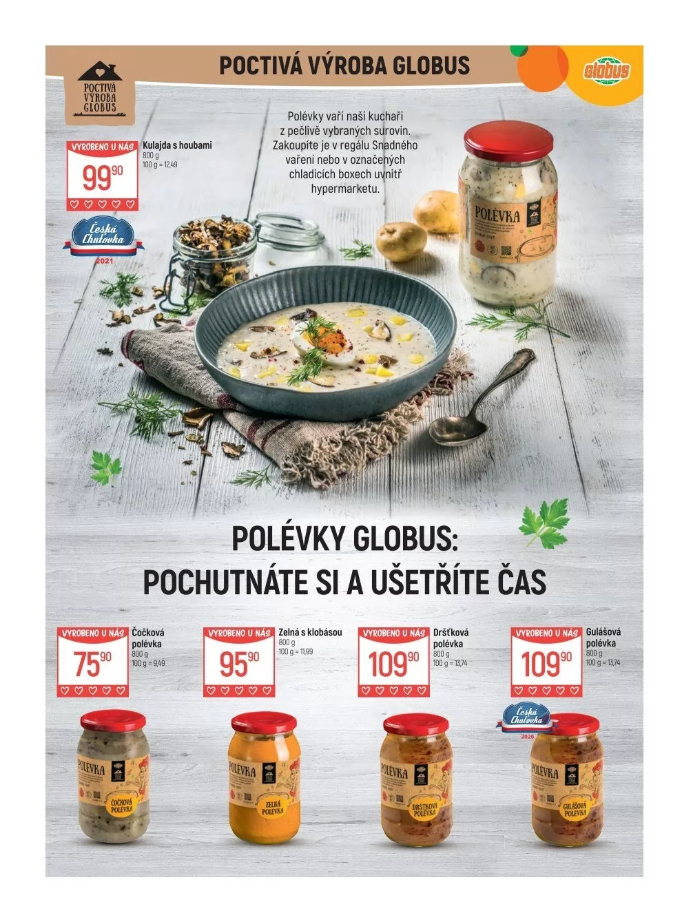 V letáku obchodu Globus najdete širokou nabídku kvalitních polévek, které jsou vyrobeny s láskou a péčí.