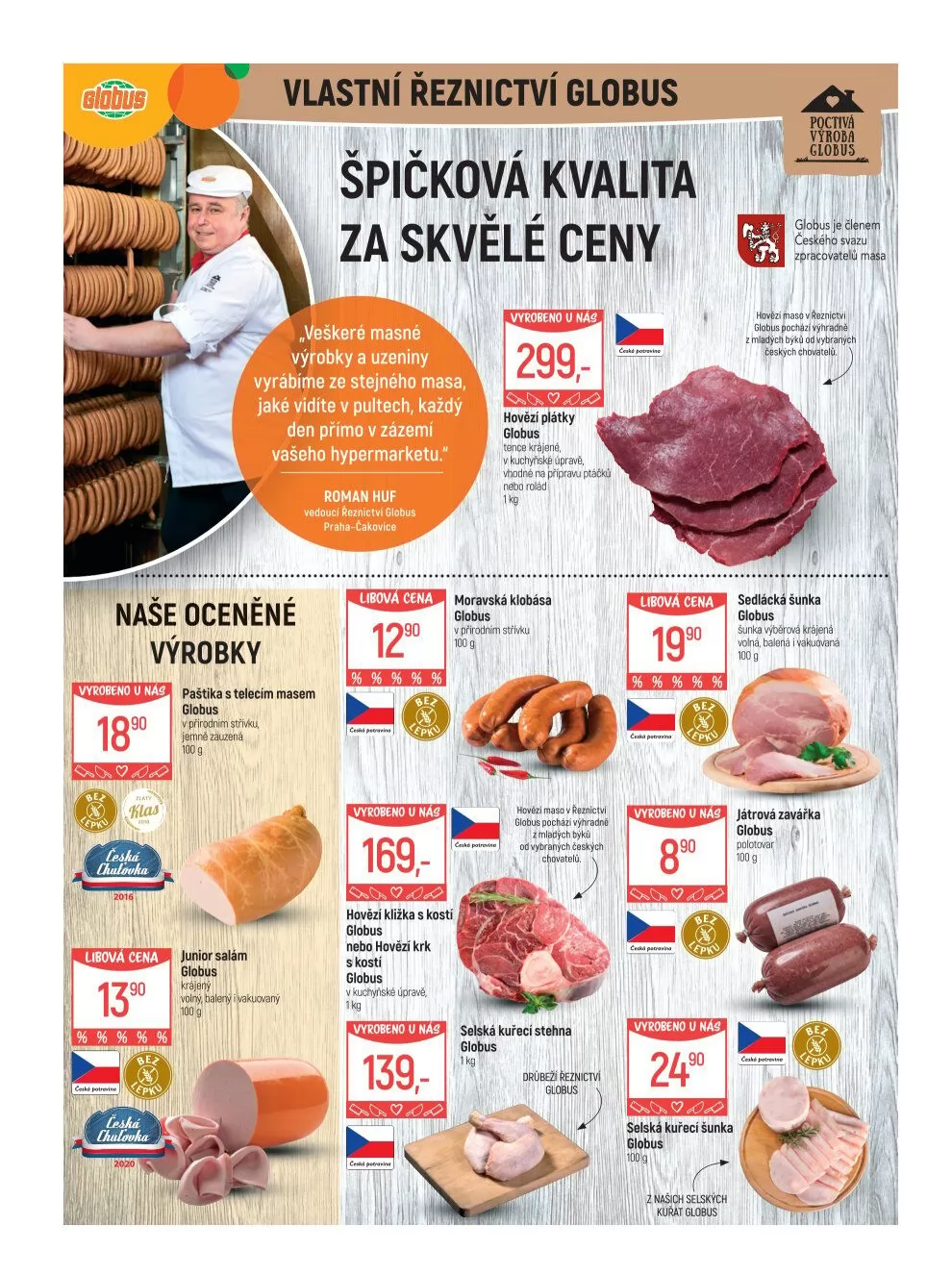 V letáku obchodu Globus najdete širokou nabídku kvalitních masných výrobků z vlastního řeznictví. Naše spičková řeznictví vyrábí veškeré masné výrobky a uzeniny přímo v zázemí hypermarketu, což zaručuje čerstvost a kvalitu.