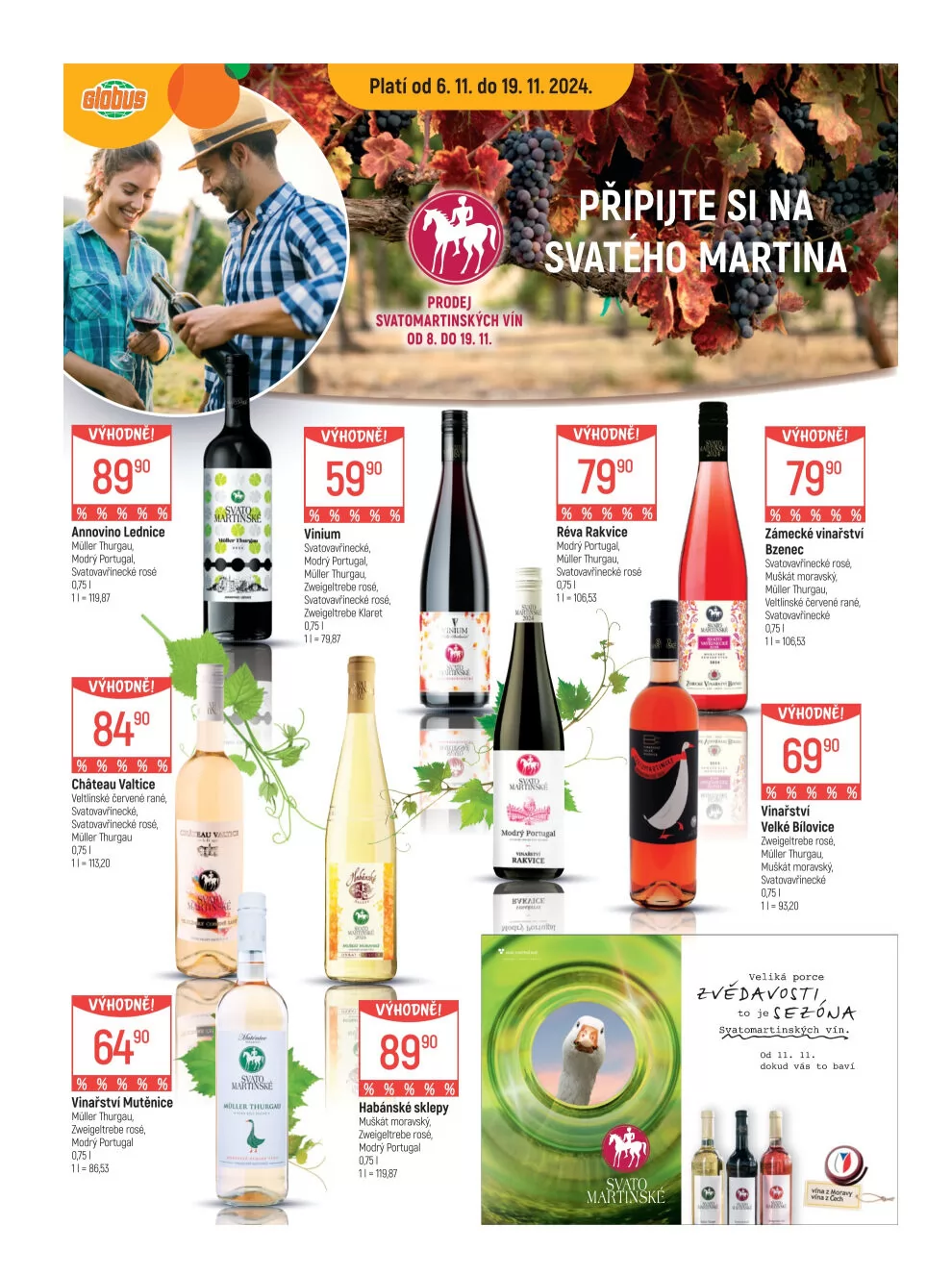 V letáku obchodu Globus, platném od 6.11. do 19.11.2024, najdete širokou nabídku svatomartinských vín. Prodej těchto vín probíhá od 8. do 19.11. Mezi vyhovujícími produkty se objevují vína jako Müller Thurgau, Modrý Portugal a Svatovavřinecké růžové.