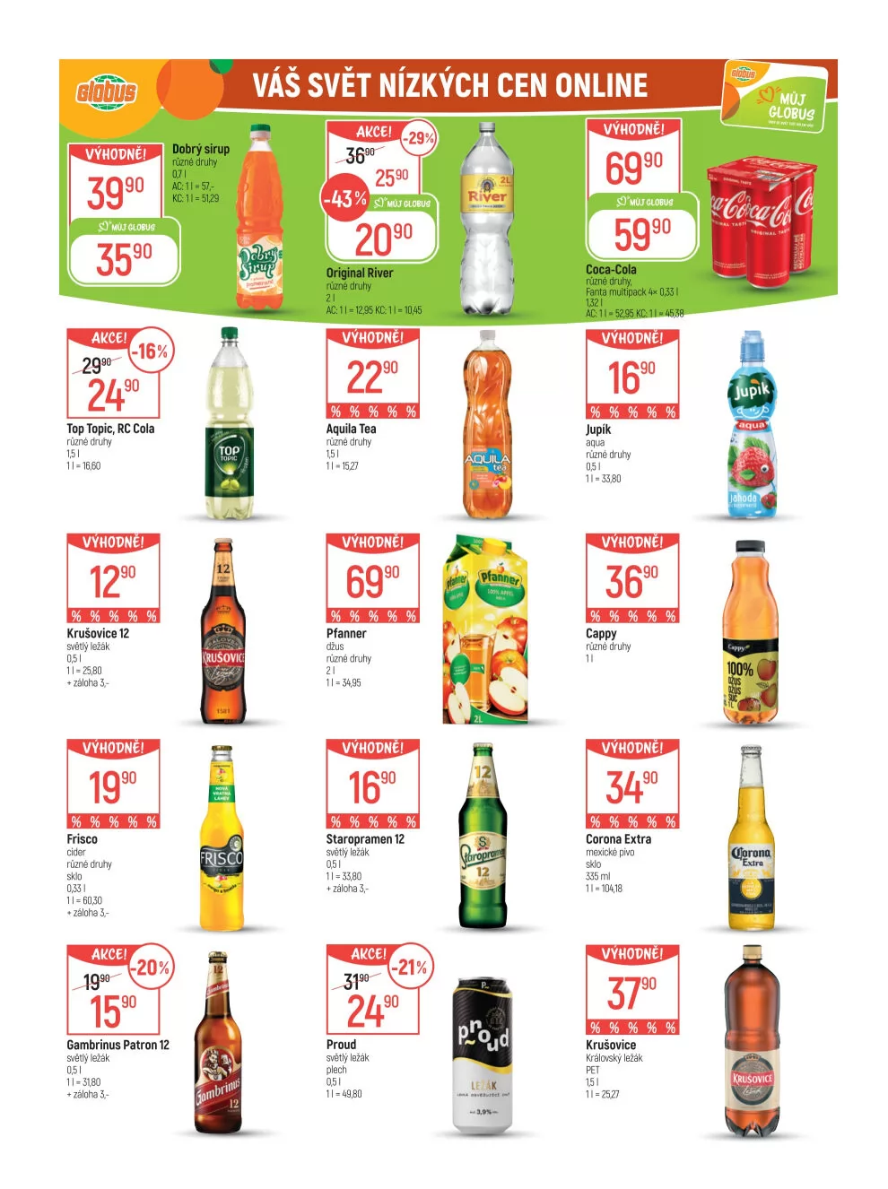 Mezi nimi se objevují oblíbené nápoje jako sirupy, různé druhy limonád a piva.
