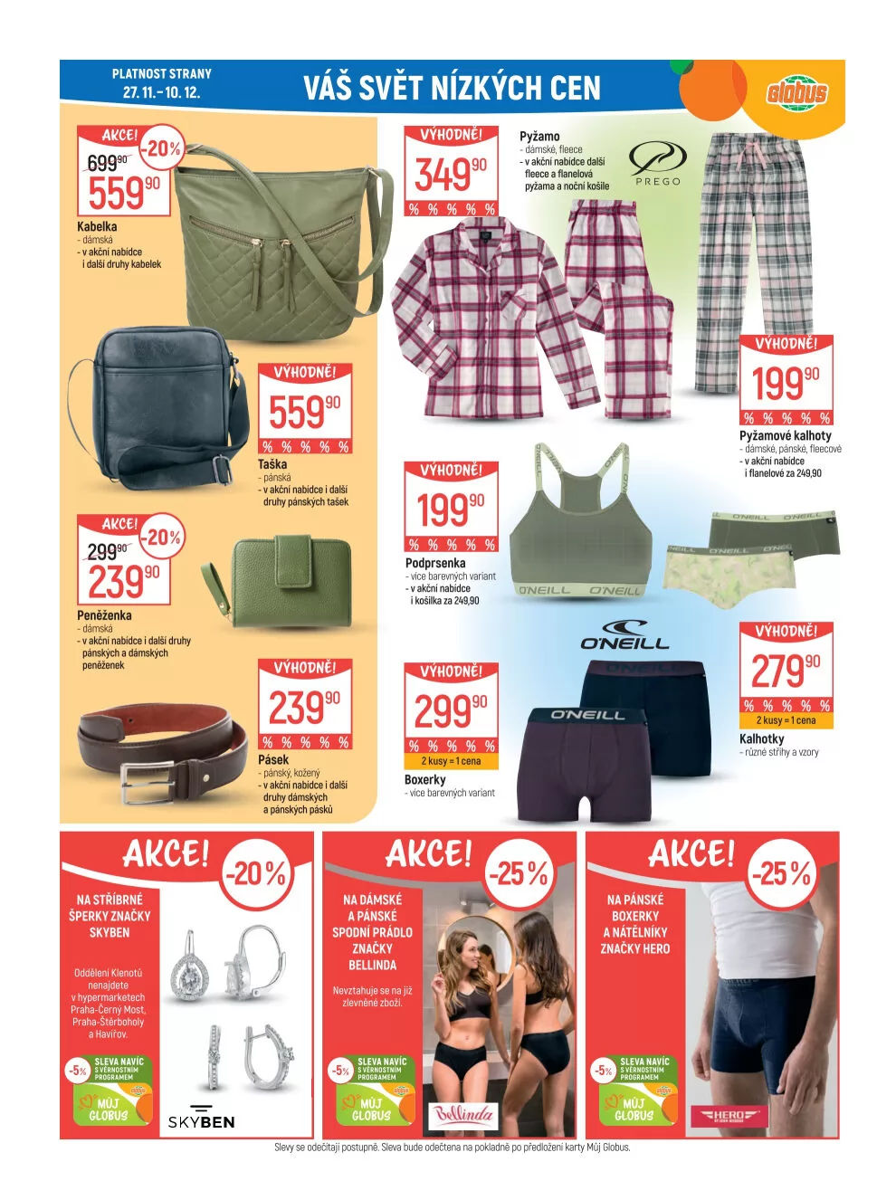 V letáku obchodu Globus najdete širokou nabídku produktů v akčním prodeji od 27.11. do 10.12. Mezi lákavé nabídky patří dámské kabelky za 559,90 Kč a peněženky za 90 Kč. Dále jsou v akci stříbrné šperky značky Skyben, které nenajdete v hypermarketech.