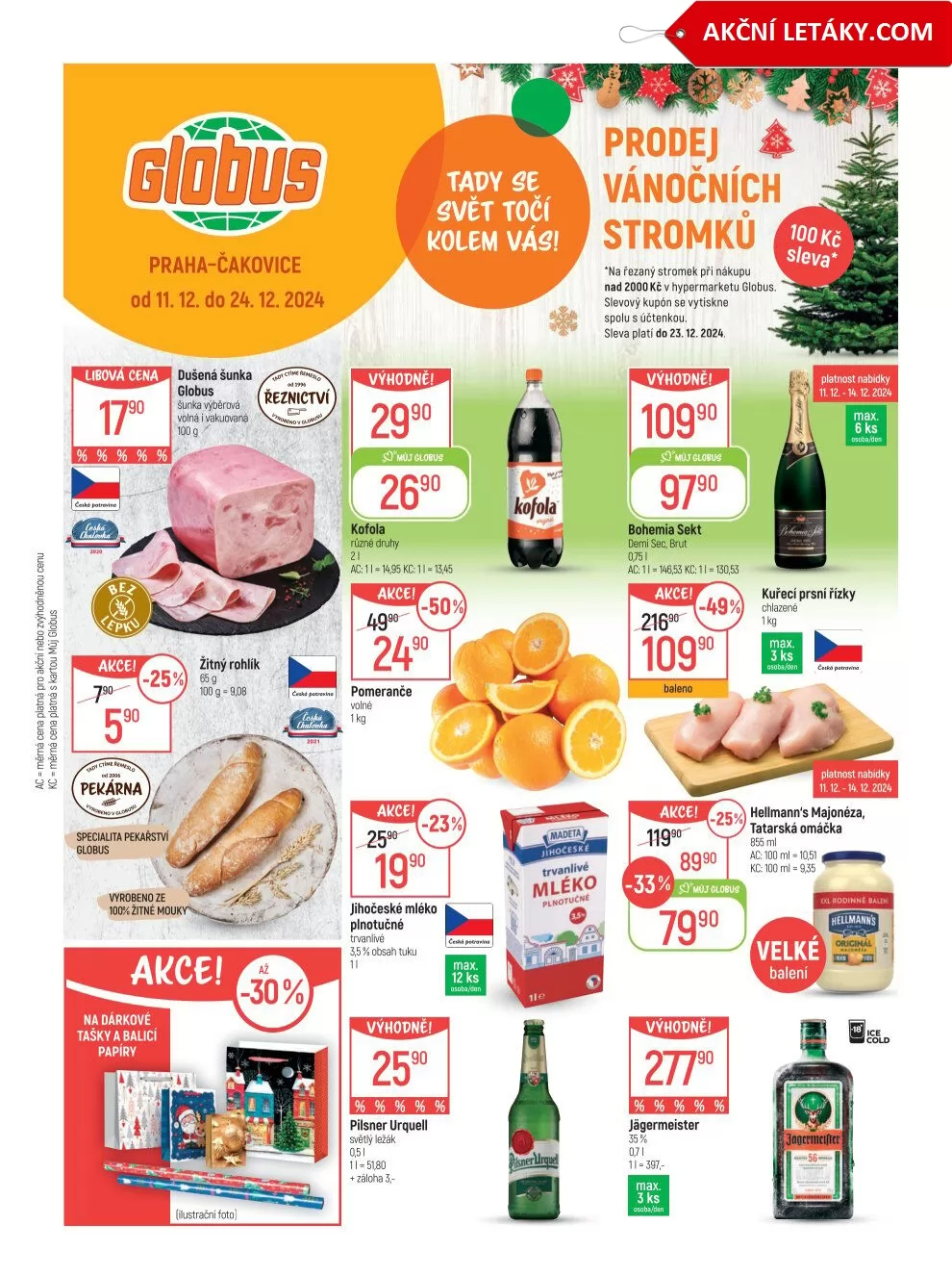V letáku obchodu Globus najdete širokou nabídku vánočních produktů a potravin. Od 12. do 24. prosince 2024 si můžete zakoupit vánoční stromky se slevou 100 Kč při nákupu nad 2000 Kč. V řeznictví Globus je v akci dušená šunka, která je vakuovaná a dostupná v 100 g balení.