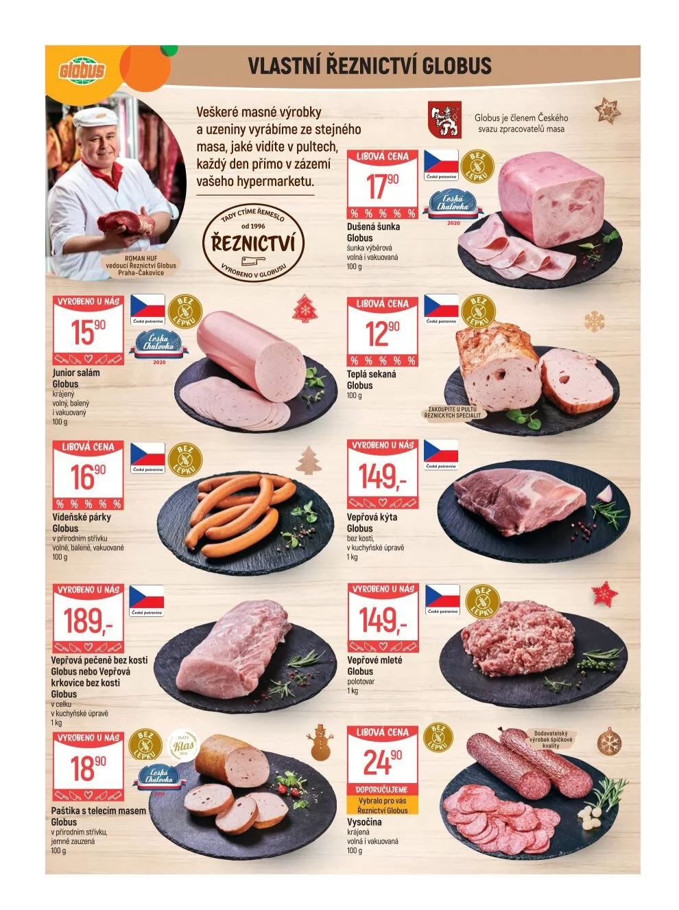 V našem vlastním řeznictví Globus nabízíme široký výběr masných výrobků a uzenin, které vyrábíme z kvalitního masa přímo v zázemí vašeho hypermarketu. Naše produkty zahrnují vepřovou pečeně bez kosti, krkovici, jemnou paštiku s telecím masem, vídeňské párky a teplou sekanou. Všechny výrobky jsou k dispozici v různých baleních, včetně vakuovaných variant. Naše ceny jsou příznivé a každý den se snažíme nabídnout to nejlepší pro naše zákazníky. Navštivte nás a objevte chuť kvalitního masa, které ctí tradici od roku 1996.