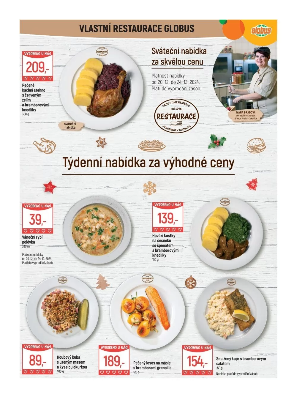 Platnost nabídky je od 20.12. do 24.12.2024, ale pozor, platí do vyprodání zásob. Navštivte naši vlastní restauraci Globus a užijte si sváteční pokrmy za skvělé ceny!