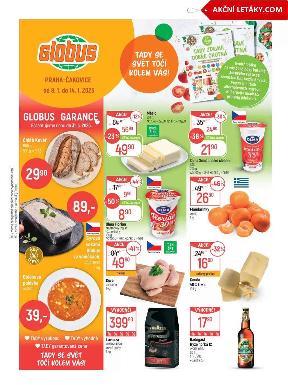 V letáku obchodu Globus, platném od 8.1. do 14.1.2025, najdete širokou nabídku produktů za garantované ceny do 31.3.2025. Mezi lákavými nabídkami se objevuje chléb Kovář za 29,90 Kč, polotovar sekaná Globus a gulášová polévka, které jsou vyrobené přímo v obchodě.