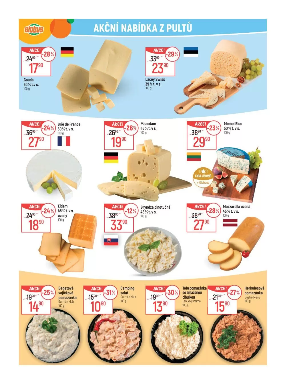 V letáku obchodu Globus najdete skvélé akční nabídky z pultů. Mezi nimi se objevují lahodné sýry jako Gouda a Brie de France, které jsou nyní za výhodné ceny. Nezapomeňte také na Eidam a uzený Maasdam, které potěší každého milovníka sýrů. Bryndza plnotučná je k dostání se slevou 23%, což je skvělá příležitost pro všechny, kdo si chtějí dopřát kvalitní výrobky. A pro milovníky modrých sýrů je tu Memel Blue a uzená mozzarella. Navštivte Globus a využijte těchto skvělých akcí!