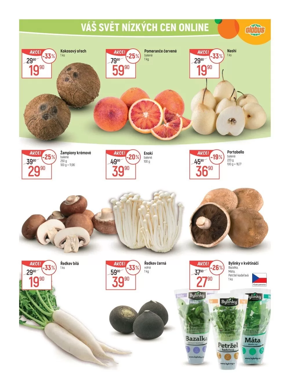 Mezi akčními položkami se objevují žampiony krémové za 29,90 Kč, ředkev bílá a černá, které jsou k dostání za 39,90 Kč.