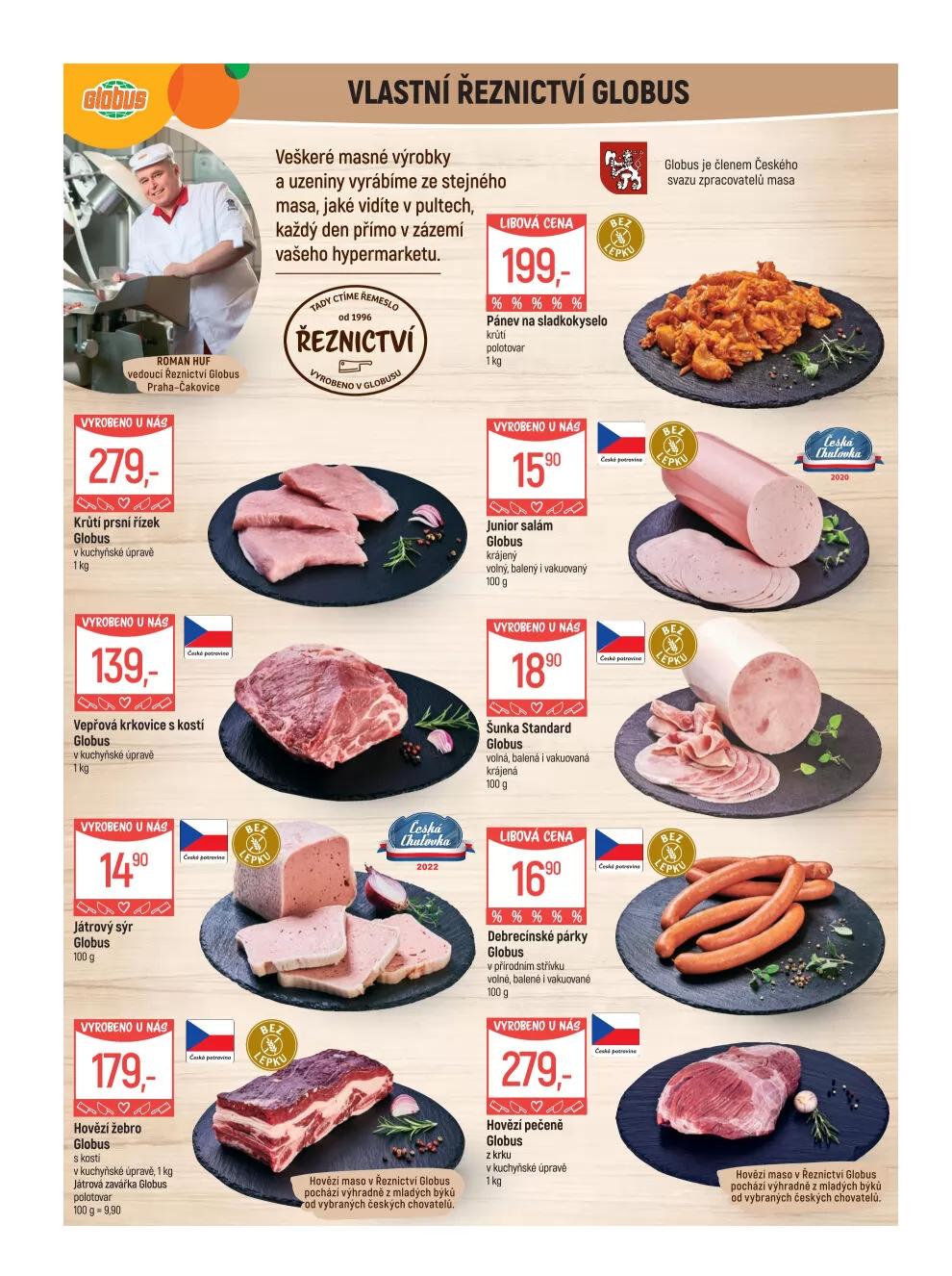 V letáku obchodu Globus najdete širokou nabídku masných výrobků a uzenin, které jsou vyráběny přímo v jejich vlastním řeznictví. Mezi nabízené produkty patří krůtí prsní řízek za 279,- Kč, vepřová krkovice s kostí za 139,- Kč/kg a hovězí žebro za 179,- Kč/kg. Dále si můžete vychutnat játrový sýr za 149,- Kč/100 g a junior salám, který je k dostání krájený a balený.