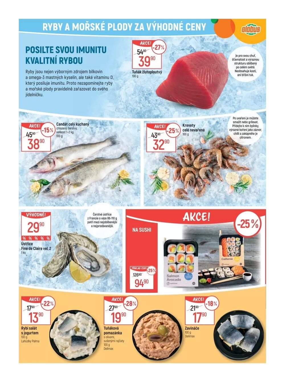 V letáku obchodu Globus najdete širokou nabídku ryb a mořských plodů za výhodné ceny. Posilte svou imunitu kvalitní rybou, která je skvělým zdrojem bílkovin a omega-3 mastných kyselin, stejně jako vitaminu D. Nezapomínejte pravidelně zařazovat ryby a mořské plody do svého jídelníčku.