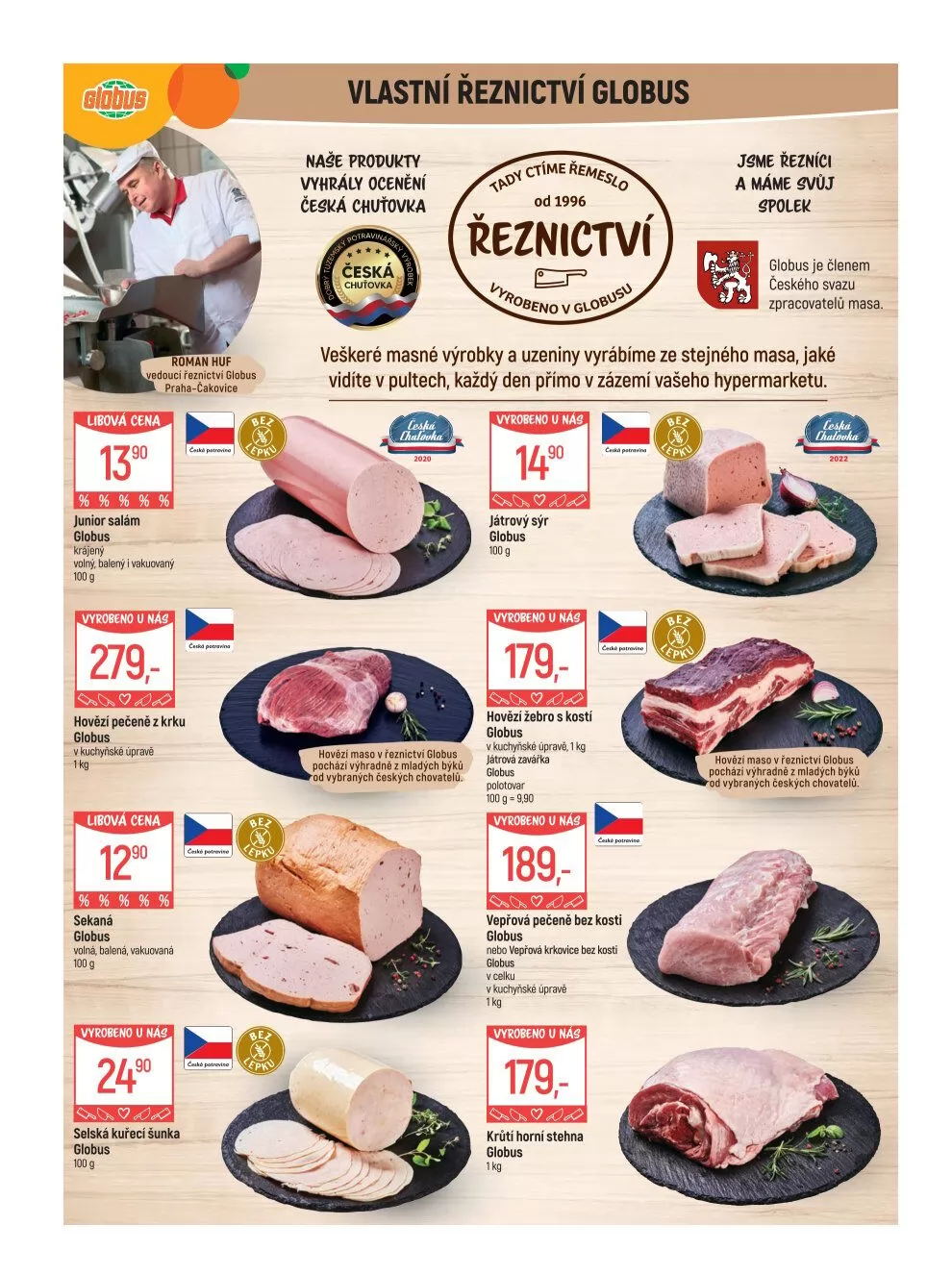 V letáku obchodu Globus najdete širokou nabídku kvalitních masných výrobků a uzenin, které jsou vyráběny přímo v jejich řeznictví. Mezi oblíbené produkty patří junior salám, hovězí pečené z krku a sekaná, které jsou dostupné v různých formách – krájené, balené i vakuované.
