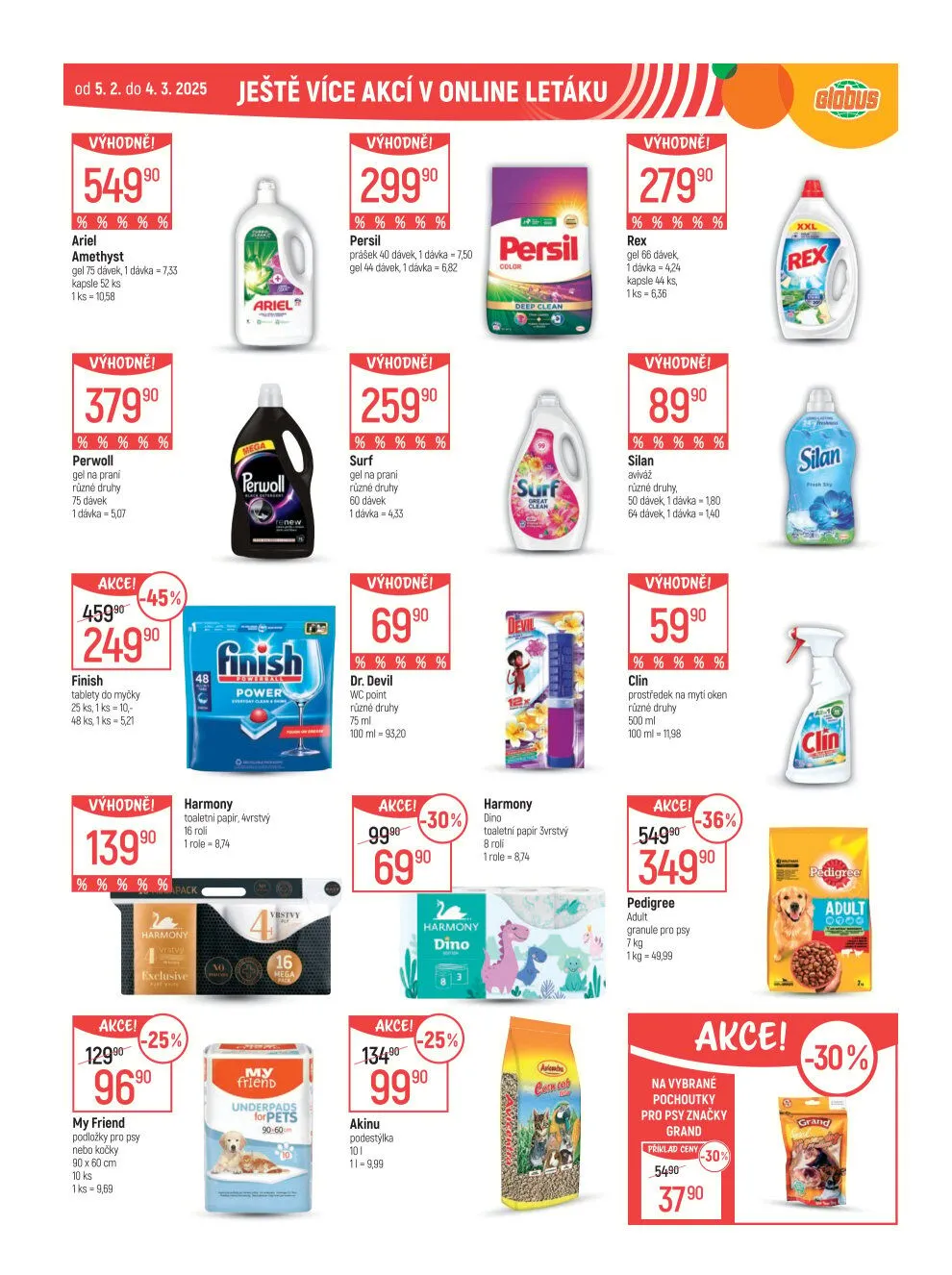 V letáku obchodu Globus najdete širokou nabídku výhodných produktů od 5.2. do 4.3.2025. Mezi nimi se nachází gel na praní Ariel Amethyst za 549,90 Kč, Perwoll na praní různých druhů za 379,90 Kč a Finish tablety do myčky za 249,90 Kč.