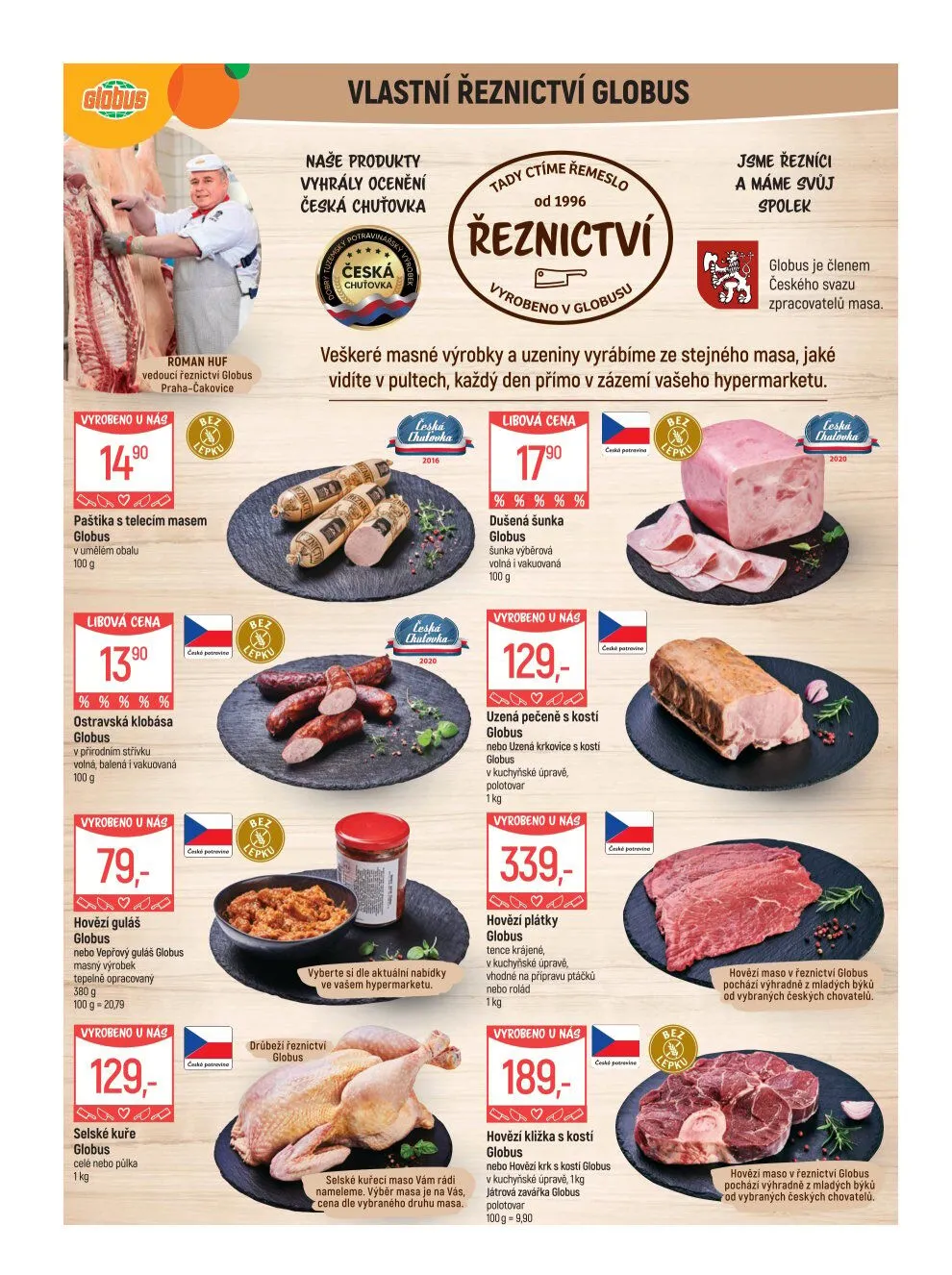 V řeznictví Globus nabízíme široký výběr kvalitních masných výrobků, které získaly ocenění za svou chuť. Naše produkty, jako je paštika s telecím masem, dušená šunka, ostravská klobása a hovězí guláš, jsou vyráběny přímo v zázemí hypermarketu z masa, které vidíte na pultech.