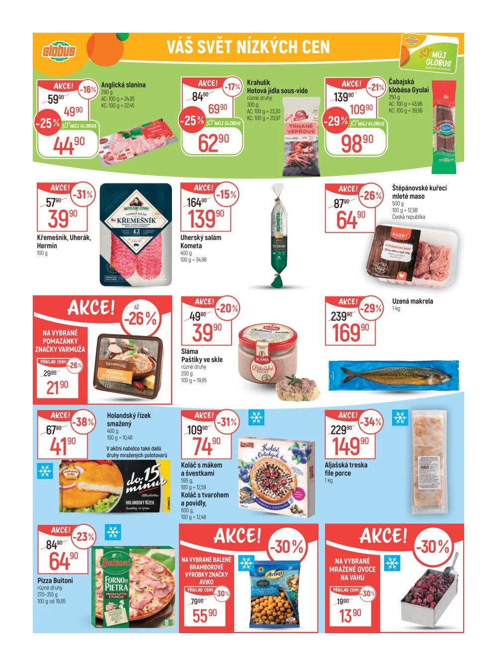 V letáku obchodu Globus najdete širokou nabídku produktů za nízké ceny. Mezi akčními položkami se objevují například křemešník, uherák a anglická slanina, které jsou nyní za skvělé ceny. Dále si můžete vybrat z různých druhů paštik ve skle nebo koláčů s mákem a švestkami.
