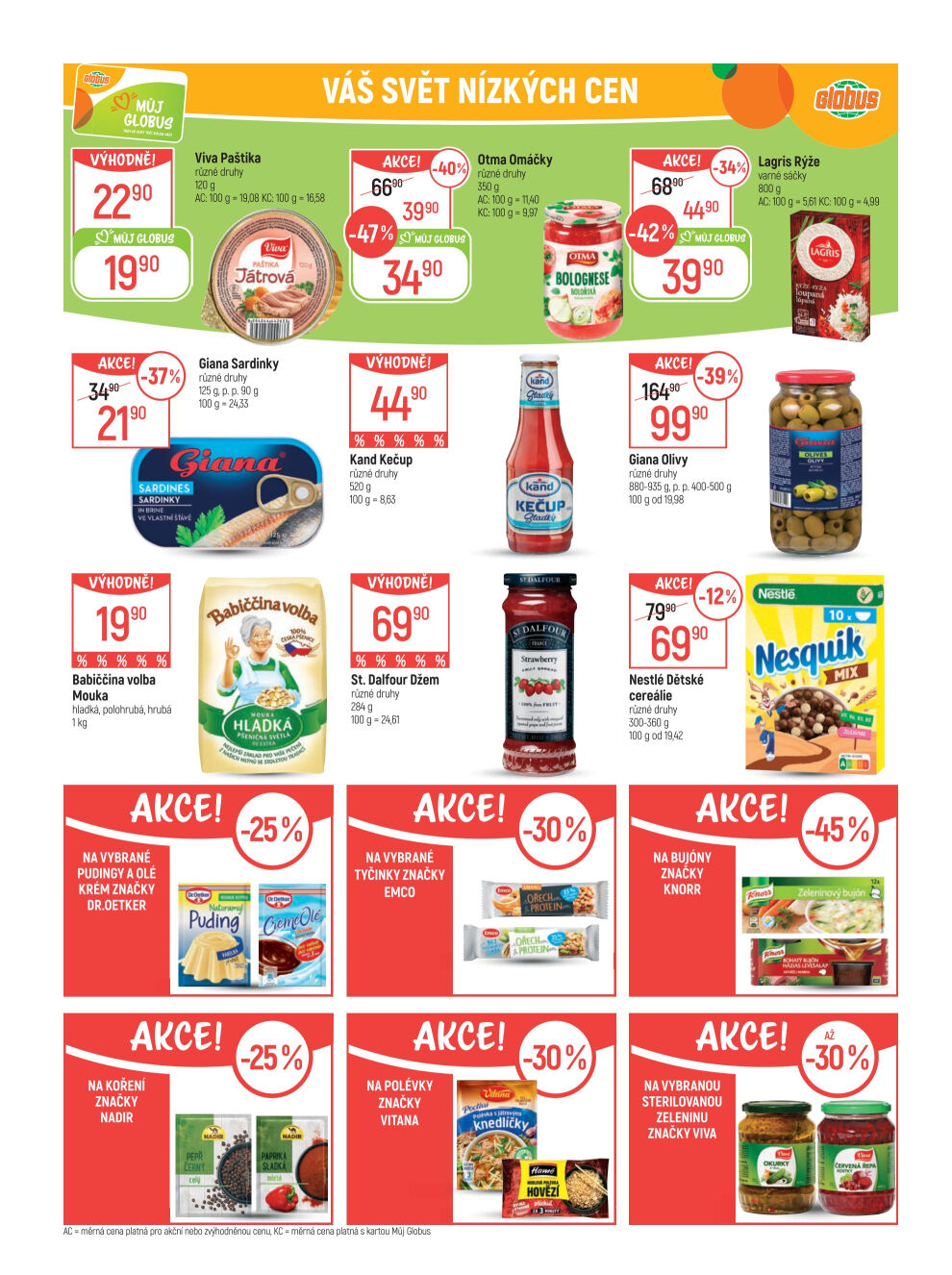 V letáku obchodu Globus najdete širokou nabídku výhodných produktů za nízké ceny. Mezi nimi se objevují různé druhy paštik Viva, sardinky Giana a omáčky Otma. Nezapomeňte také na kečup Kand a džemy St. Dalfour. Pro pečení si můžete vybrat z mouky Babiččina volba, a pokud máte rádi olivy, Giana nabízí různé varianty. Děti potěší cereálie Nestlé a pro přípravu jídel doporučujeme rýži Lagris a pudingy Dr. Oetker. Všechny tyto produkty jsou nyní v akci, takže neváhejte a využijte skvělých nabídek!